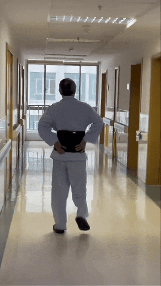 术后第二天,在康复医学科医生的指导下,童大爷佩戴腰围便可平稳站立、在病房内轻松踱步。