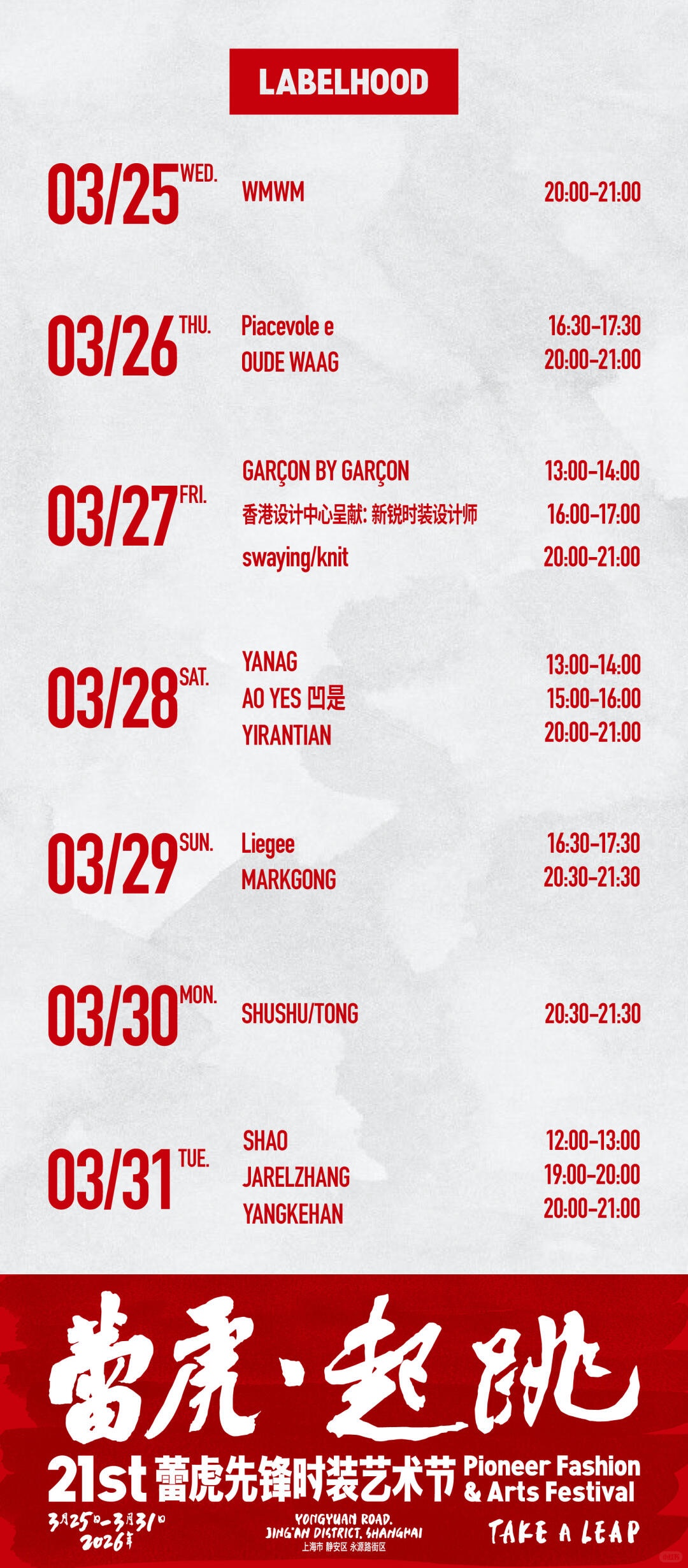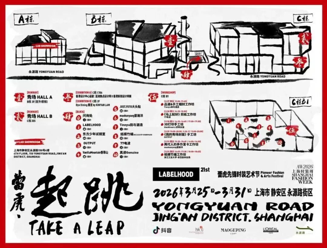 2026秋冬上海时装周于3月25日拉开帷幕。3月25日—31日,第21季蕾虎先锋时装艺术节以“蕾虎·起跳(Take a Leap)”为主题,在静安区永源路街区正式启幕。在变化之中的行业节奏里,蕾虎以“向上起跳,向下生长”为线索,通过秀场、展览与街区文化活动等,邀请创作者们与公众共同进入一个持续发生的创意现场。