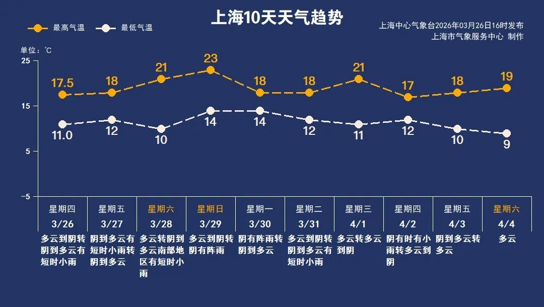 双休日白天基本没有雨水打扰,天气以多云为主,气温继续稳步上升,周日最高气温23℃左右,将是近期的一个小高峰。白天可以适时安排洗晒和出行,需要留意周六夜间南部地区会有些短时小雨,周日夜里起到下周一,有一次较明显的降雨过程。下周整体以过程性天气为主,呈现晴雨相间的节奏。气温小幅波动,最高气温保持在17~21℃,降雨日气温略有降低,最低气温也多在10℃以上。春天天气系统移速快,请大家多多关注最新天气信息。
