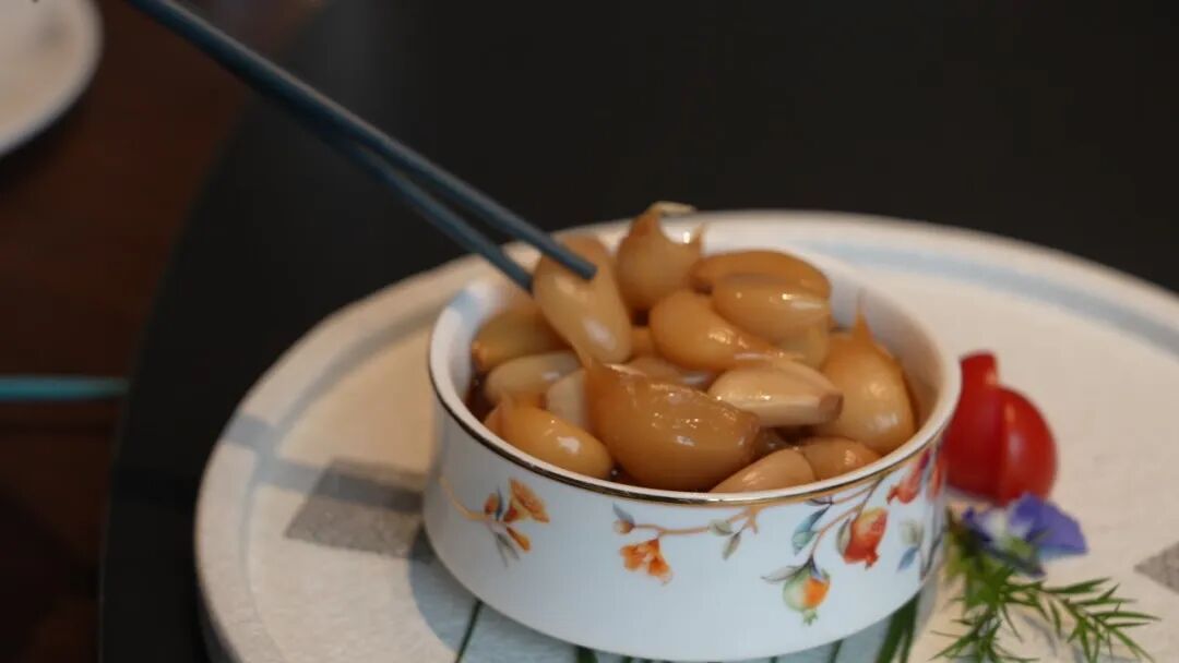 “鼎鼎有名的嘉定白蒜做的,小辰光的开胃菜。”嘉定有“三白”,这一桌里先亮出一白:嘉定白蒜。作为一道经典的冷盘,71对这道菜格外亲切,顾晨从旁补充,介绍起嘉定白蒜的特点:蒜香浓郁却不辛辣,入口爽脆,带着微微的回甘,是老嘉定人餐桌上离不开的那一口。