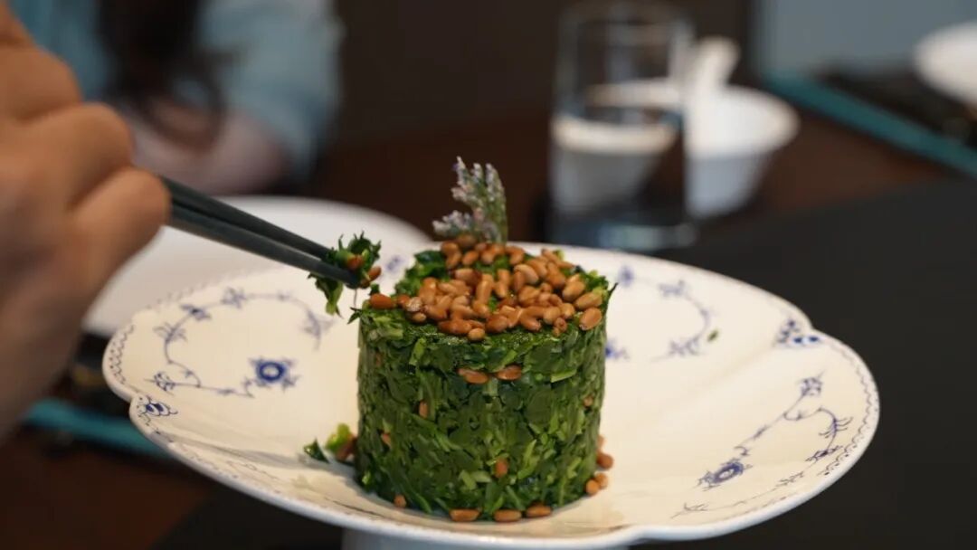 开胃冷盘之外,春日限定也是一桌菜的特色。窗外春和景明,一盘马兰头拌松仁应景上桌。71说,嘉定人习惯叫它“红梗菜”,过去田埂河滩边随处可见,家家户户都爱挖来拌香干吃。