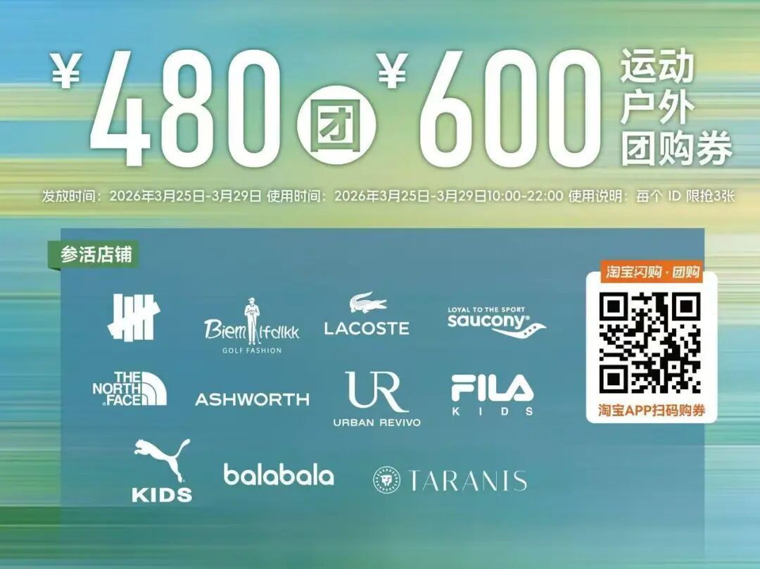 在中海真如环宇城MAX,3月25日至29日,可通过淘宝APP扫码参与480团600运动户外团购券活动,适用于The North Face、LACOSTE、PUMA KIDS等指定参与品牌,一次性购齐当季春款服装。