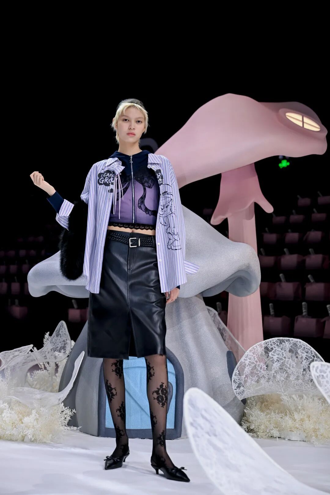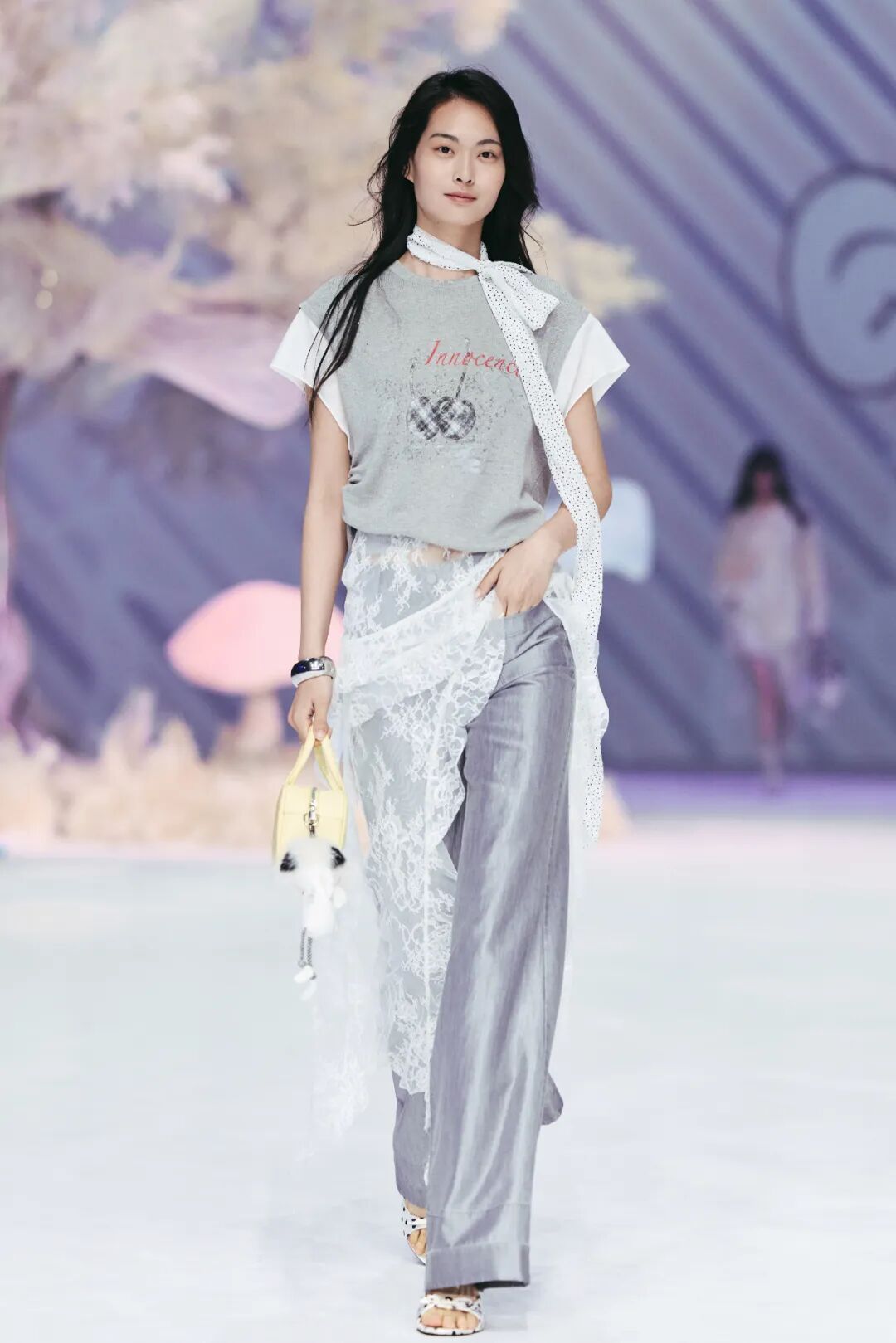 品牌方介绍,本次大秀以品牌专利花型蕾丝为核心,糅合前沿工艺打造而成,其中传承百年的Leavers Lace(列维斯蕾丝)工艺更是点睛之笔,将专利花型蕾丝与小绵羊皮、小羊皮、亚麻、高支棉感面料等多元材质创新碰撞,巧思诠释“柔韧交织,反差时髦”的设计内核,打造适配多元场景的穿着风格。