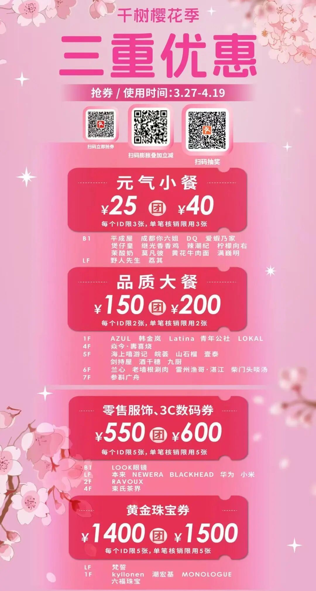 上海时装周之际,普陀区多家商场上新团购优惠促销活动。天安千树樱花季将在3月27日-4月19日推出优惠活动,可扫码抢券、膨胀叠加立减,涵盖元气小餐券、品质大餐券、零售服饰与3C数码券、黄金珠宝券四个类目。