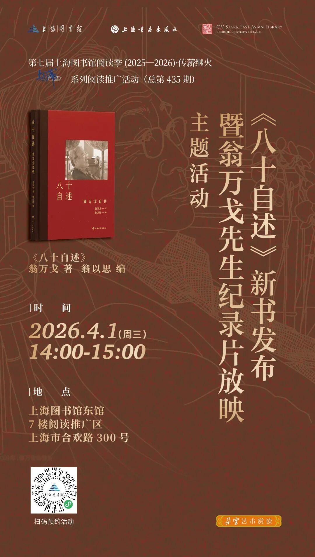 为传承文化精神、促进学术交流,上海书画出版社联合上海图书馆及美国哥伦比亚大学史带东亚图书馆,共同举办“《八十自述》新书发布暨翁万戈先生纪录片放映”主题活动。活动期间将播放翁万戈先生监制的纪录片《Free Reading for All 有书大家读》。