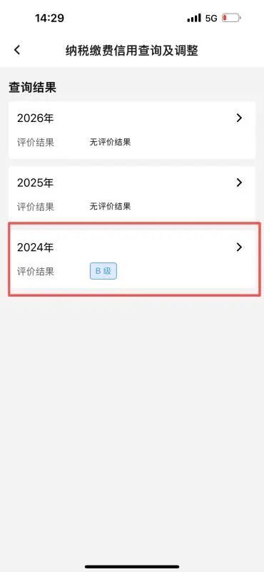 在【纳税缴费信用管理】界面,查询结果会显示各年度纳税评级信息,您可以选择您所需要查询的对应年份点击进入查询。