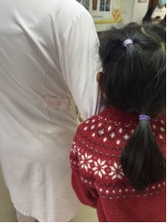 让在场所有人都意外的是,换药结束后,晏之突然从治疗床上爬起来,张开小胳膊,一把抱住了护士的脖子。她把脸埋在护士的肩膀上,小声地、软软地叫了一声:“妈妈。”(图2:晏之紧紧抱着护士阿姨)