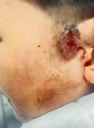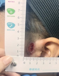 护士轻轻揭开她耳朵上覆盖的旧纱布,那个久治不愈的创面暴露在灯光下——耳前瘘管开口处周围是一大片暗红色的炎性浸润,中央有一个蚕豆大小的破溃口,正渗出黄色的脓液,带着淡淡的臭味。创面边缘的皮肤因反复感染而增厚,像一小块干涸的田地,周围还残留着之前换药时干结的血痂和黑乎乎的药。(图1:治疗前的伤口)