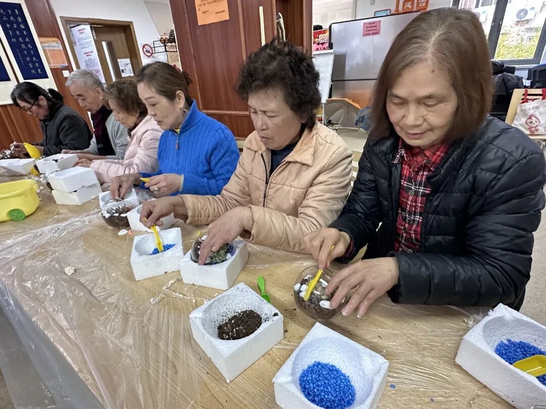在延吉社区第二睦邻中心社工们的指导下,居民们利用透明玻璃容器、彩色砂石、多肉植物、迷你小摆件及专用营养土,亲手构建起一个个迷你的生态系统。铺陶粒、加彩砂、填营养土,大家小心翼翼地挑选植物品种、设计色彩层次,现场欢声笑语不断。