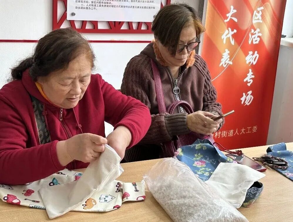 这份由指尖传递的社区温情,在几天后又得以延续。延吉社区第二睦邻中心又开展了“健康生活—手作艾垫 暖心护腰”活动。在社区非遗老师的带领下,20位社区居民利用提前准备好的海盐、艾草、粗布、针线等材料,亲手制作暖心护腰。老师详细讲解了艾草的功效及制作步骤,从挑选优质艾草到均匀铺设,再到仔细缝合边缘,手把手地进行耐心指导。