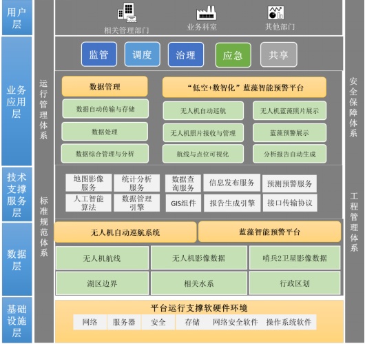 本场景总体思路围绕上海市湖泊蓝藻治理的实际需求,为生态环境、水环境等相关管理部门构建“低空感知+智能分析+业务应用”的一体化蓝藻监测预警平台,实现蓝藻的快速发现、预警和分析的全自动化流程,为淀山湖水环境管理提供全流程、数智化支撑。