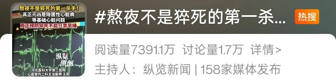 河北医科大学第二医院心血管内二科主治医师王莉介绍,真正导致心源性猝死的头号元凶,是隐匿性心脏病、冠心病、恶性心律失常等基础心脏问题,熬夜只是导火索和诱发因素,会让心脏的负荷暴增、诱发意外。