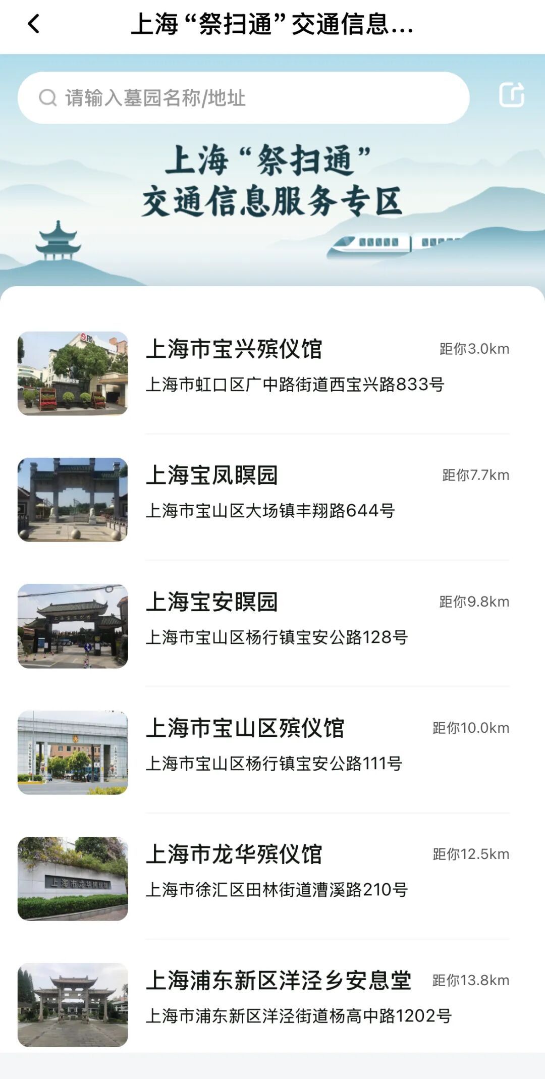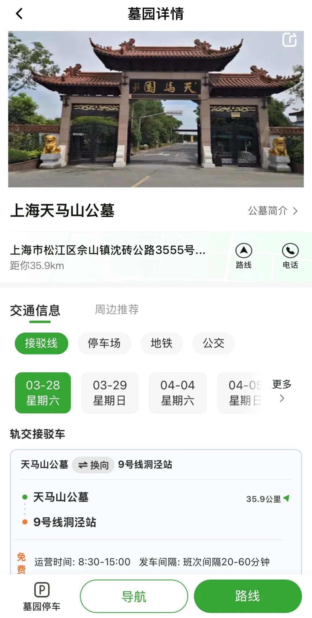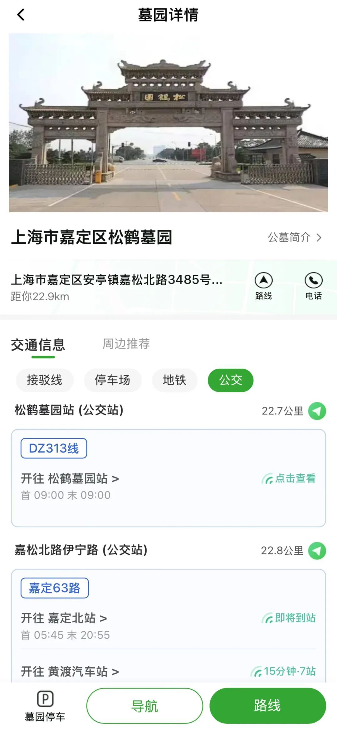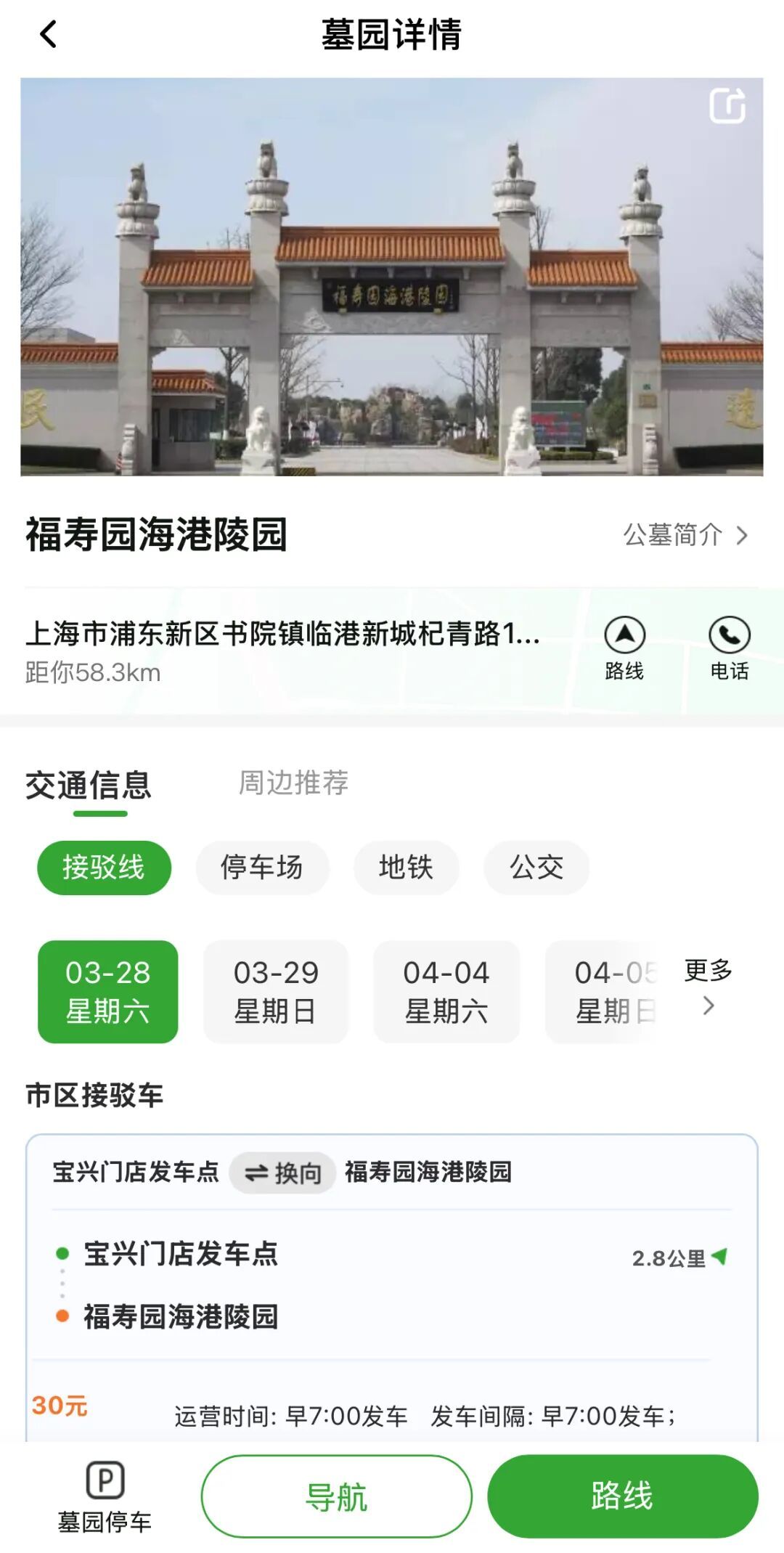 在“祭扫通”专区搜索您要去的墓园,进入详情页后点击“交通信息”,就能查到所有接驳线路的信息:上车点在哪里、发车时间怎么安排、票价是多少,一目了然。