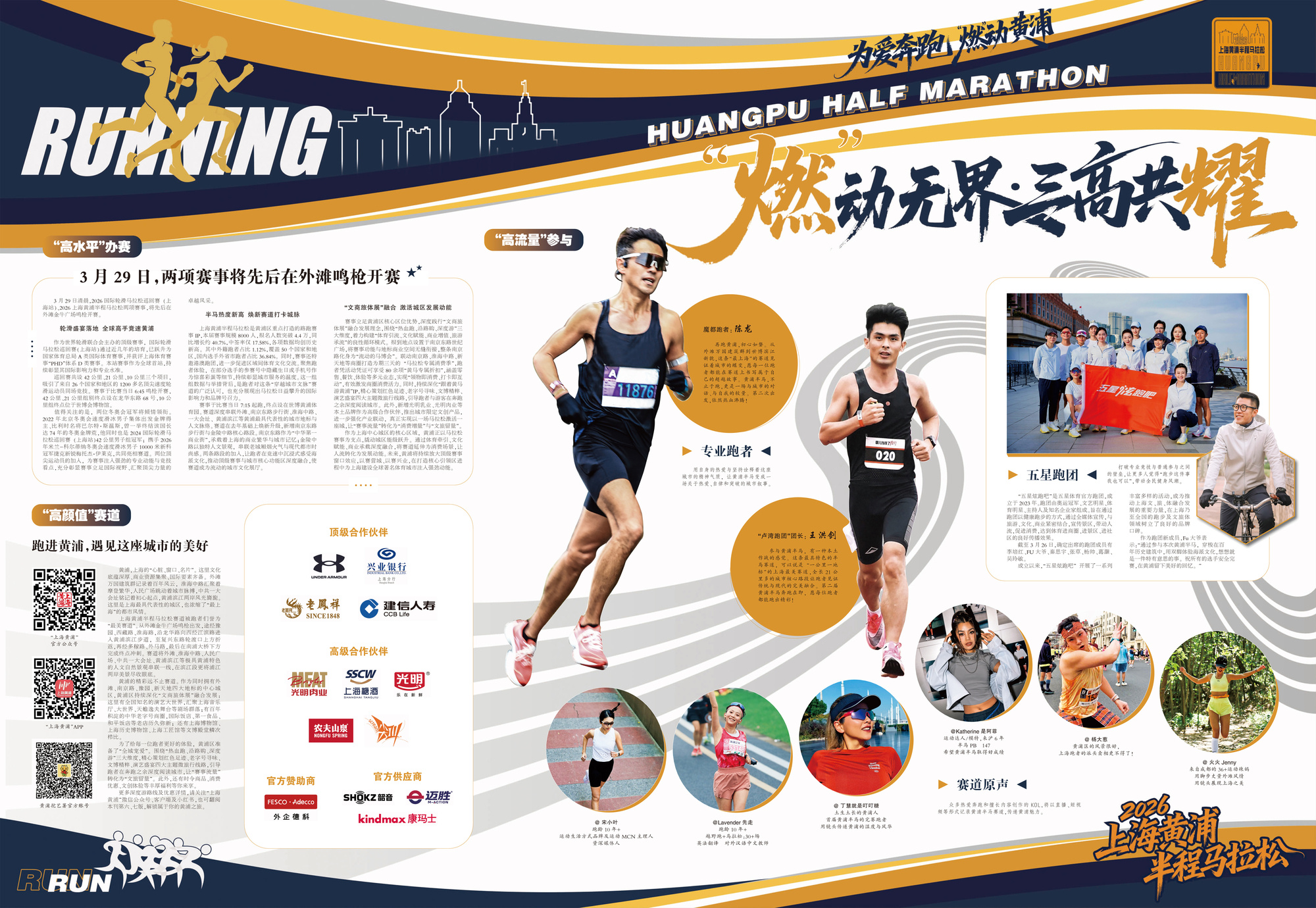 “高水平”办赛版块,详细介绍了两项赛事将先后在外滩鸣枪开赛;“高颜值”赛道版块,邀请广大跑者们踏上这条“最美赛道”,遇见这座城市的美好;“高流量”参与版块,聚焦于专业跑者、“五星跑团”以及众多热爱奔跑和擅长内容创作的KOL,通过直播、短视频等形式传递黄浦魅力。