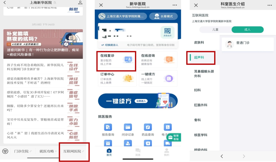 2.进入【互联网医院】→ 选择【在线复诊】→选择【超声科】