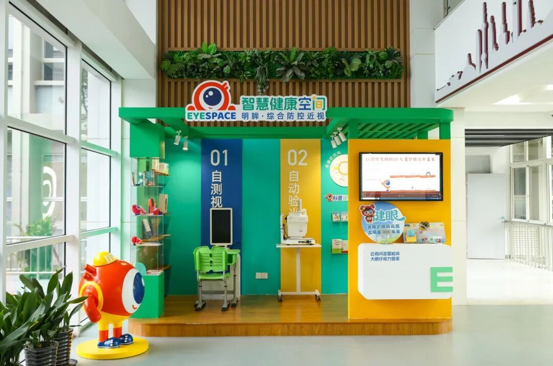 课间,新落成的“EYESPACE明眸智慧健康空间”受到了孩子们的欢迎,他们自主进行视力检测和验光,还可以了解不少护眼小知识。