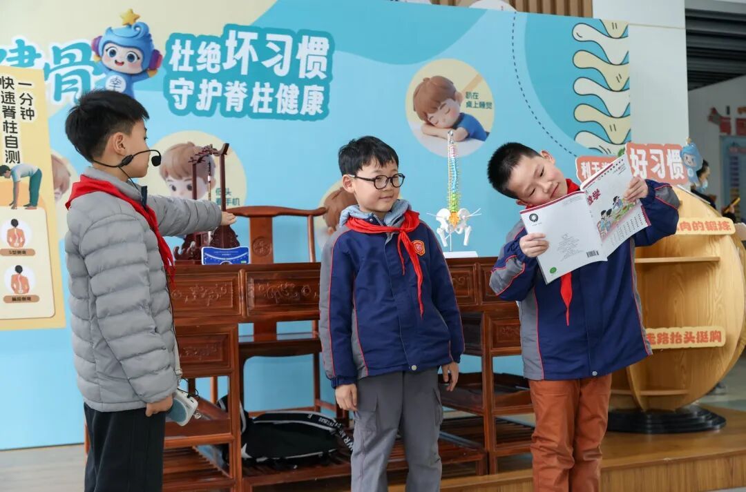 学校还要求学生每日开展不少于60分钟的中高强度运动,每周开展3天以上篮球、网球等抗阻运动,增强腰背肩部肌肉力量,并将脊柱弯曲异常筛查纳入一年一度的体检,建立脊柱健康档案,“长期单肩背书包、歪着脑袋看书都是不利于脊柱健康的。”三年级男生朱子恒学到了不少保护脊柱的小妙招,“我们要加强颈部肌肉锻炼,避免长时间低头,走路要昂首挺胸。”