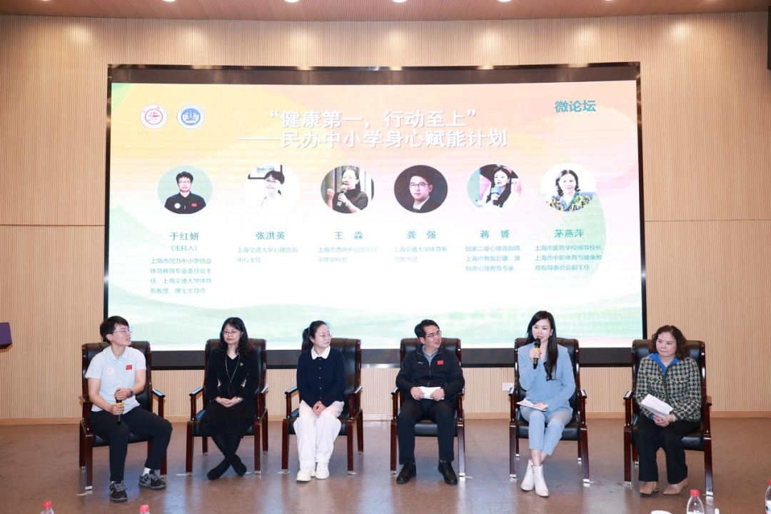 随后的微论坛由上海交通大学体育系教授于红妍主持,上海交通大学体育系党委书记龚强,国家二级心理咨询师、上海市教委赴疆滇特邀心理教育专家蒋赟,上海市医药学校德育校长、上海市中职体育与健康教育指导委员会副主任茅燕萍,上海交通大学心理咨询中心主任张洪英,上海市西外外国语学校小学部校长王淼,围绕“健康第一,如何行动”展开了一场接地气、有深度的对话。与会嘉宾一致认为:身心健康促进需要打破学科边界,将体育、心理、德育有机融合,通过课程重构、评价改革与全员参与,真正实现“以体强心、以心促体”的良性循环。