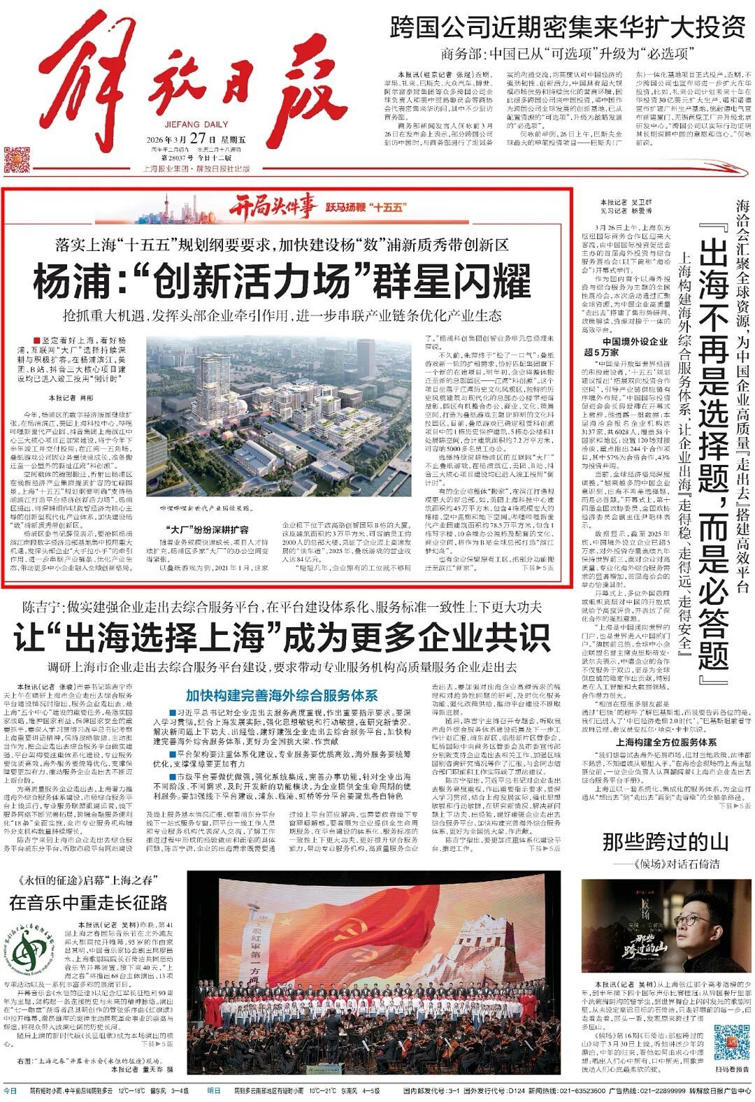 3月27日,《解放日报》头版刊文《杨浦:“创新活力场”群星闪耀》,报道聚焦杨浦加快建设杨“数”浦新质秀带创新区,数字经济版图继续扩张,抢抓重大机遇,发挥头部企业牵引作用,进一步串联产业链条优化产业生态。美团、B站、抖音三大核心项目建设均已进入竣工投用“倒计时”。一起来阅读全文↓ 《杨浦:“创新活力场”群星闪耀》 今年,杨浦区的数字经济版图继续扩张。在杨浦滨江,美团上海科技中心、哔哩哔哩新世代产业园、抖音集团上海滨江中心三大核心项目正加紧建设,将于今年下半年竣工并交付投用;在江湾—五角场,叠纸游戏公司因业务量快速成长,准备搬迁至一公里外的新址江湾“科创源”。 空间载体的腾挪搬迁,折射出杨浦区在线新经济产业集群提质扩容的忙碌图景。上海“十五五”规划纲要明确“支持杨浦滨江打造平台经济创新活力场”。杨浦区提出,将深耕细作以数智经济为核心主导的创新型现代化产业体系,加快建设杨“数”浦新质秀带创新区。 杨浦区委书记薛侃表示,要抢抓杨浦滨江南段数字经济总部基地集中投用重大机遇,发挥头部企业“大手拉小手”的牵引作用,进一步串联产业链条、优化产业生态,带动更多中小企业融入全域创新格局。 随着业务规模快速成长、项目人才持续扩充,杨浦区多家“大厂”的办公空间变得紧张。 以叠纸游戏为例。2021年1月,这家企业租下位于政高路创智国际B栋的大厦。这座建筑面积约3万平方米、可容纳员工约2000人的总部大楼,见证了企业迈上高速发展的“快车道”。2025年,叠纸游戏的营业收入达84亿元。 “短短几年,企业原有的工位就不够用了。”杨浦科创集团创智业务单元总经理朱萍说。 不久前,朱萍终于“松了一口气”:叠纸游戏新一轮的扩租需求,恰好匹配集团旗下一个新的在建项目。明年初,企业将整体搬迁至新的总部园区——江湾“科创源”。这个项目坐落于江湾历史文化风貌区,独特的历史风貌建筑与现代化的总部办公楼宇相得益彰。园区有机整合办公、商业、文化、策展空间,打造为叠纸游戏主题IP鲜明的文化科技园区。目前,叠纸游戏已确定租赁科创源项目中的1栋历史保护建筑、5栋办公楼和1处展陈空间,合计建筑面积约7.2万平方米,可容纳5000多名员工办公。 选择持续深耕杨浦区的互联网“大厂”不止叠纸游戏。在杨浦滨江,美团、B站、抖音三大核心项目建设均已进入竣工投用“倒计时”。 美团上海科技中心效果图 哔哩哔哩新世代产业园效果图 有的企业将整体“搬家”,在滨江打造规模更大的新总部。如,美团上海科技中心建筑面积约45万平方米,包含4栋规模宏大的塔楼、空中连廊和地下空间。哔哩哔哩新世代产业园建筑面积约78.5万平方米,包含1栋写字楼、10余幢办公独栋及配套的文化、商业空间,将作为B站全球总部打造“滨江梦幻岛”。 抖音集团上海滨江中心效果图 也有企业保留原有工区,把部分功能搬迁至滨江“新家”。 在抖音新江湾广场办公园区,林立的办公楼宇下,早晚高峰依旧人流如织。玻璃幕墙内的格子间里,夜晚依旧灯火通明。在抖音集团上海滨江中心,建筑面积约11.5万平方米的新工区也在加紧建设,将于今年竣工并启动人员入驻。 头部“大厂”纷纷“押注”杨浦区,在于这一地区鲜明的创新基因,清晰的科创布局。 杨浦区发展改革委相关负责人表示,杨浦区教育资源丰富、人才资源集中、科技企业集聚,是数字经济和平台经济发展的沃土。随着新一轮科技革命和产业变革,支持数字经济和平台经济发展,是实现新旧动能转换的发力点。 看空间布局,一个个“创新活力场”热力四射。杨浦区加快建设东部大滨江功能拓展区和西部环高校功能提升区,持续提升江湾—五角场城市副中心能级,加速开展复兴岛未来城市创新实验,推动创新要素全域贯通、相互赋能。 “战略留白”多年的复兴岛,开始显山露水。复兴岛聚焦未来城市创新实验,将深化量子城市时空创新基地建设,探索超大城市智慧治理新范式。利用独特地理优势、丰富工业遗存和特色生态资源,引进国际顶尖产业孵化主体,全力打造全球创客岛。 互联网“大厂”扩容,科学家社区在建,高层次人才集聚……杨浦区将全方位对接,提供精准的政策举措和便利服务。 最近,杨浦区滨江办为滨江交通的整体提升工作忙得脚不沾地。“美团、B站、抖音等项目整体投用后,预计新增三四万通勤人群,对区域交通是很大挑战。”区滨江办工作人员告诉记者,区滨江办正在和区建管委、相关街道和杨浦滨江集团等单位共同梳理交通路网、研究接驳线路、协调网约车临时车位。 一个个难点正在突破和解决。区里开设了“杨数浦秀带1线”DZ118定制公交,从杨浦滨江出发,衔接中交、中节能、美团、B站、抖音等多家企业园区和地铁站、轮渡站等多处交通枢纽。滨江交通的整体提升工作,打消了企业的顾虑。 支持数字经济和平台经济发展,杨浦“全城总动员”。杨浦区“十五五”规划纲要提出,加快建设全主体参与、全要素统筹、全链条加速的杨“数”浦新质秀带创新区,进一步提升区域创新体系整体效能。 在杨浦的区域发展中,头部企业不只是参与者,更是产业生态的引领者、产业链条的带动者。 对杨浦的创新生态,商米科技副总经理张金普深有感触。12年前,一家名不见经传的初创企业,如今已发展