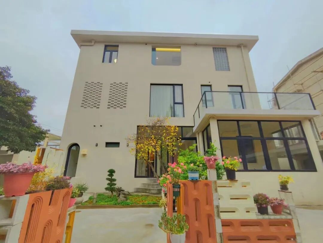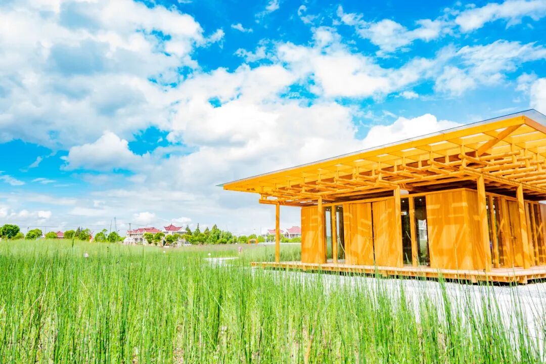 沿着顾泾河漫步,村宅改造的“竹隐清境”民宿代表了乡村对未来的探索,这座由海归三兄弟返乡改造的现代建筑,拥有包豪斯风格的灰白外墙、巨大的玻璃窗,虽区别于传统古村落,却又有美学上的和谐。小院屋后是蜿蜒的顾泾,旁侧保留了原有的泾浜,一片百年竹林被木质小径环绕,颇有“曲径通幽”的意境。“小院边的河流会随着每天的潮汐变化水流方向,涨潮的时候,竹叶落到水里会聚集在靠近村宅的那侧,落潮时又会飘到另一侧。静坐在小院里喝茶,可以感受到每天的潮起潮落。”在周丽娜看来,“竹隐清境”的存在可以让更多人感受“曲水泾浜”的独特魅力。而这种“新与旧”的碰撞与共生,在最新的示范项目“花隐小院”中得到了完美融合,网红“类屋顶”休闲区以叠瓦造型复刻传统屋顶纹路,室内天花板上,木横梁搭配月浦竹编,让传统文化在沪派江南的营造中得以活态传承,处处流露着“陪伴式设计”的匠心。