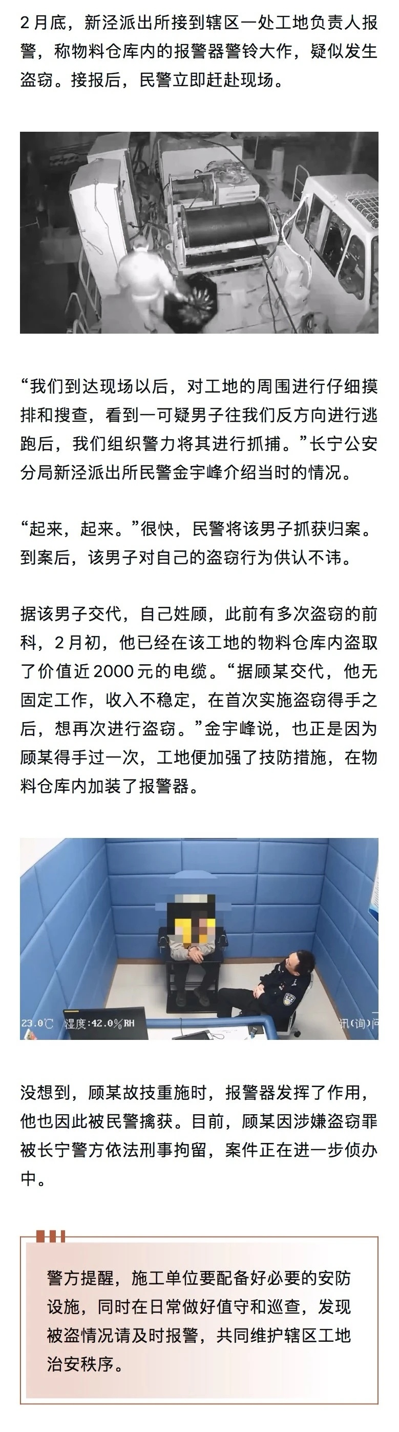2月底的一个晚上,新泾镇一尚未开工的工地物料仓库内突然发出警报声,工人们都还没开工,怎么会有人出现在物料仓库内呢?
