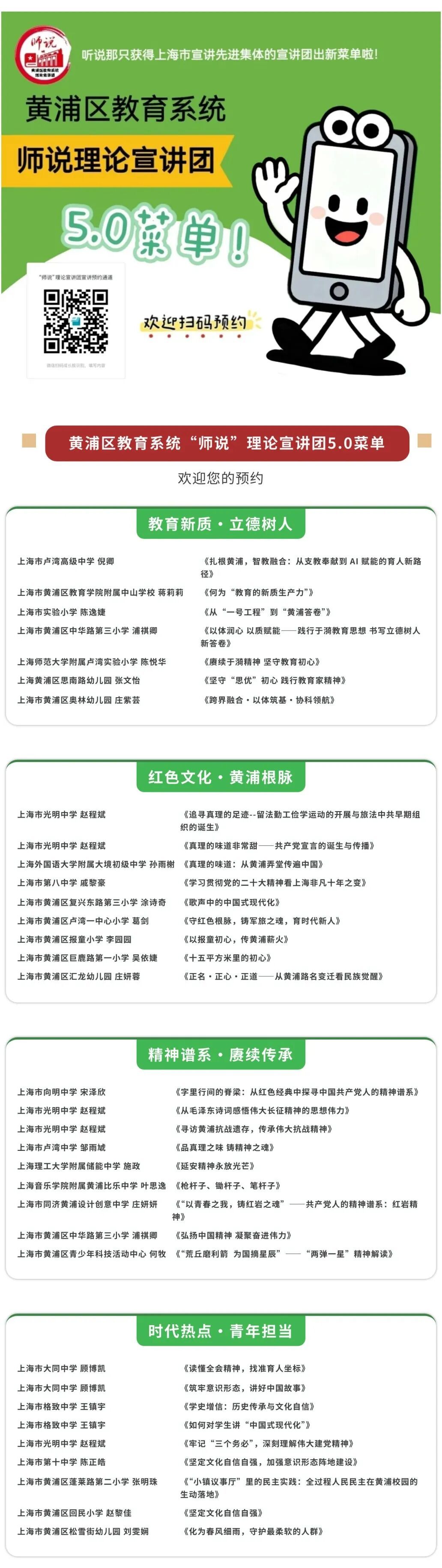 在黄浦这片红色资源丰富且文化底蕴深厚的土地上,教育不仅仅是知识的传授,更是思想的传递与精神的引领。为进一步推动教育系统理论宣讲的深入开展,提升师生的思想认识与理论素养,黄浦区教育系统师说理论宣讲团始终发挥着至关重要的作用。如今,备受瞩目的第三届换届工作圆满完成,宣讲团以全新的姿态再度出发,精心打造的全新菜单正式发布,为广大受众带来一场场精彩纷呈、启迪心智的理论盛宴,欢迎大家的预约~