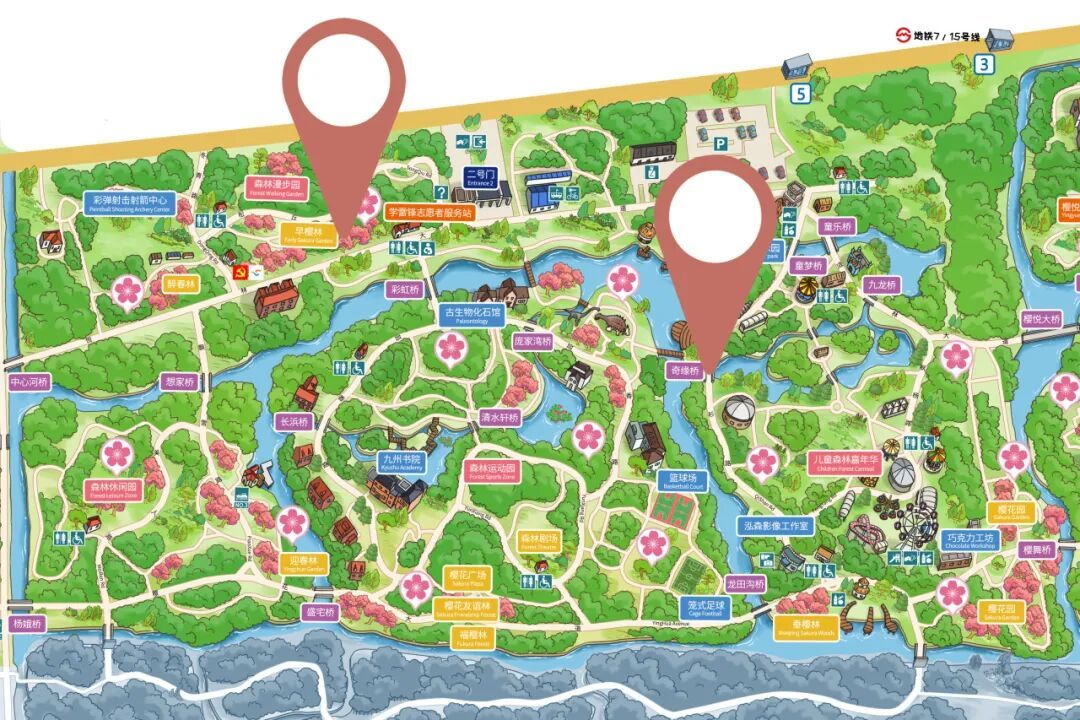 顾村公园2号门紧邻轨道交通7号线、15号线顾村公园站。