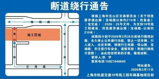 为配合轨道交通19号线建设,经区交通委、区规划资源局、区交管支队等部门研究同意,3月26日起,通达路(宝杨路以南约210米路段)进行封闭施工并永久废弃,停止公共通行功能,禁止一切社会车辆及行人进入。