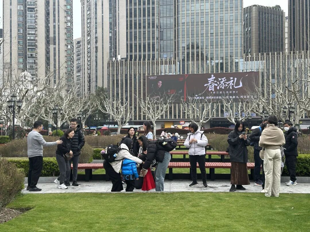 上午十点,记者在徐家汇书院广场看到,不少市民闲聊漫步,孩童嬉闹;有人在书院廊下静坐休憩;也有人举起手里的相机和手机拍照打卡留念,记录下雨后的春色。