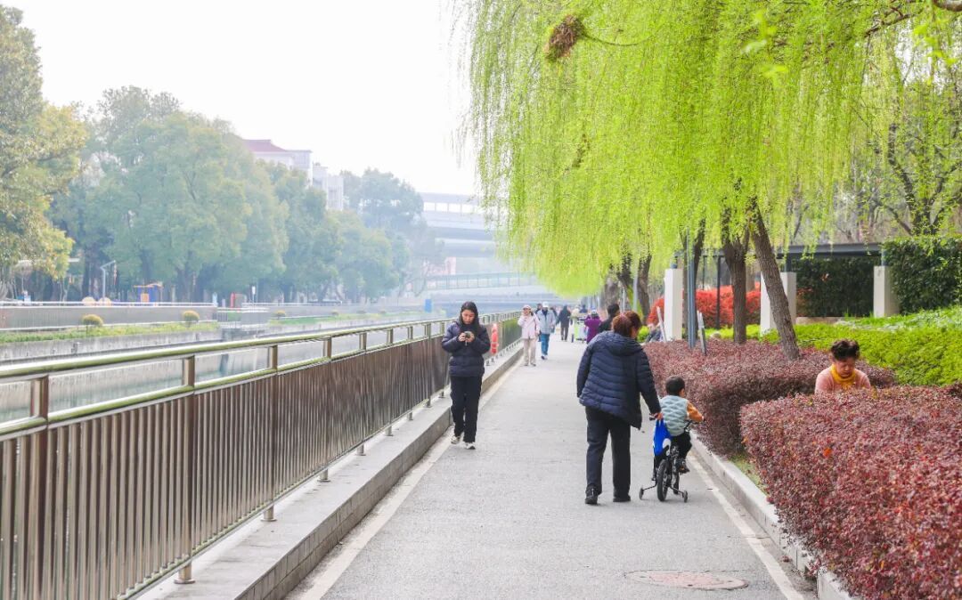 春色里更藏着鲜活的人间烟火。健身区里居民伴着春光舒展筋骨,步道上散步赏景的人络绎不绝,欢声笑语和着春风,成了春日最动人的注脚。