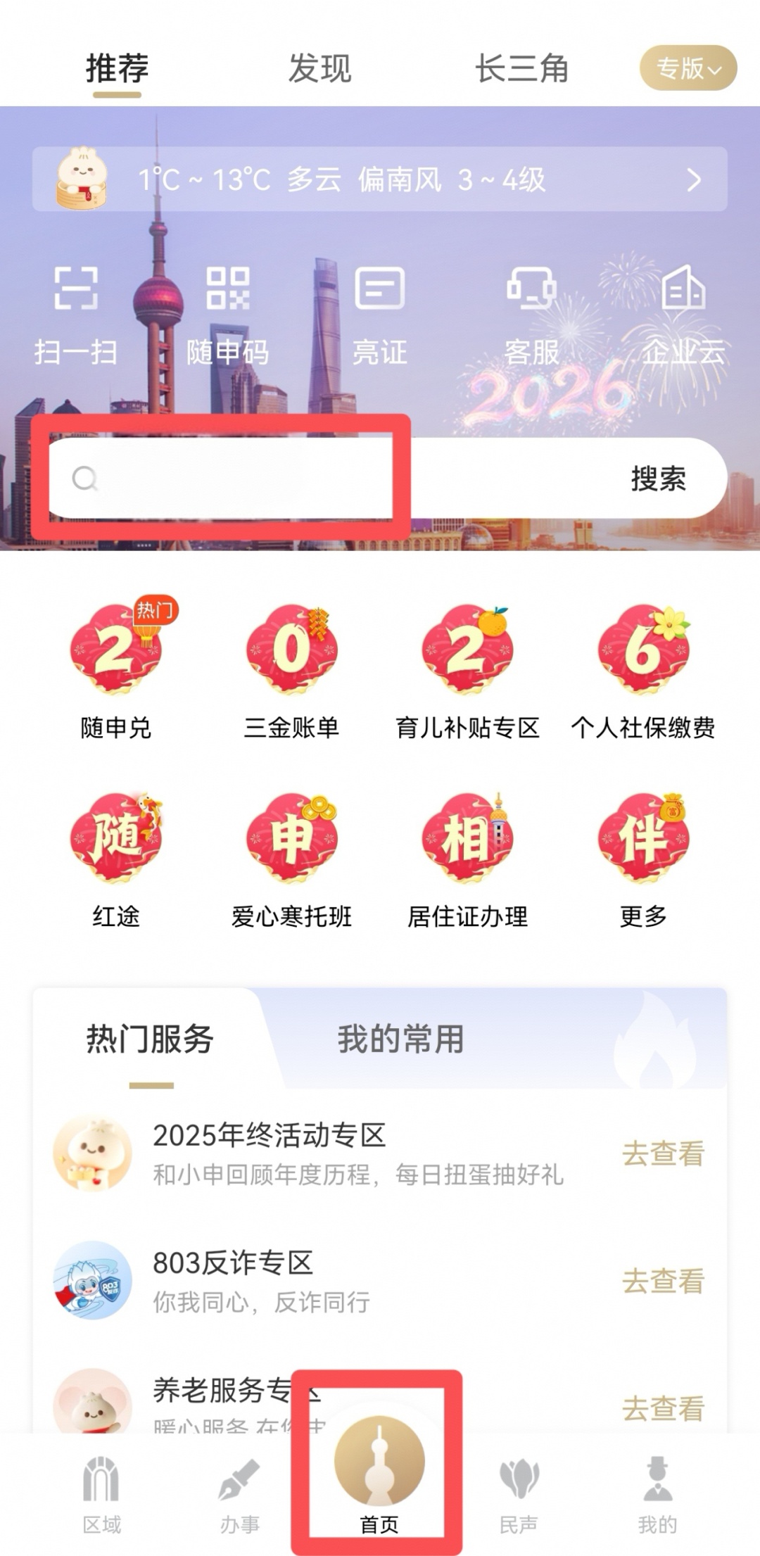 1、登录“随申办市民云”APP后,在“首页”点击搜索栏;