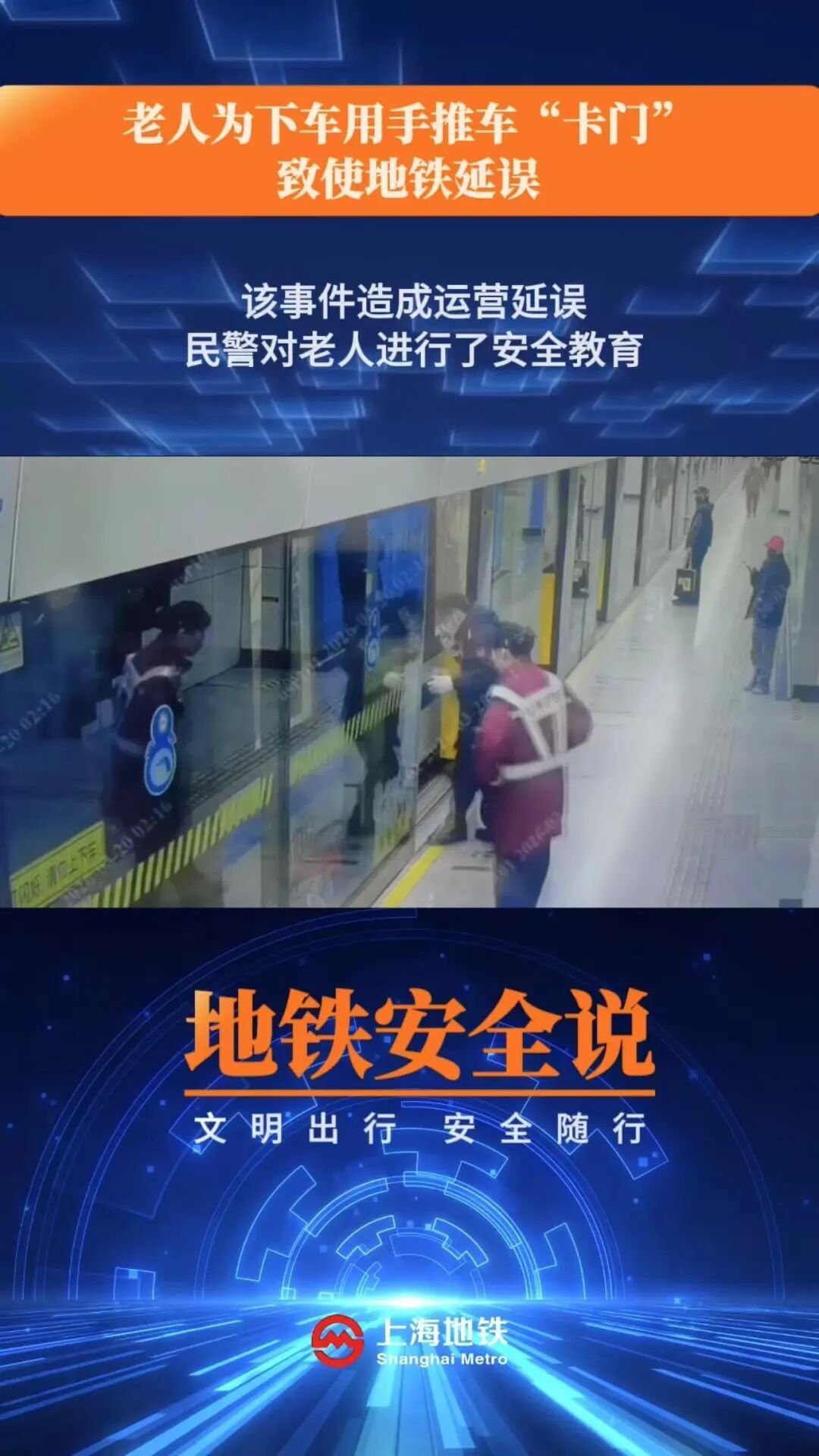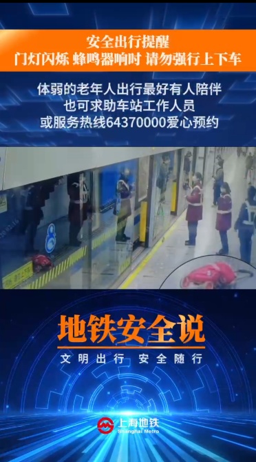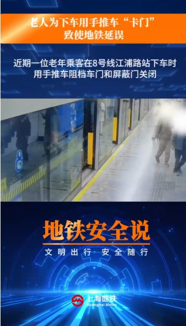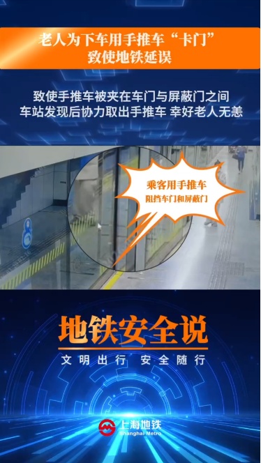 近期,一位老年乘客在8号线江浦路站下车时,用手推车阻挡和屏蔽门关闭,致使手推车被夹在车门与屏蔽门之间。车站发现后协力取出手推车,幸好老人无恙。该事件造成运营延误,民警对老人进行了安全教育。安全出行提醒:门灯闪烁,蜂鸣器响时,请勿强行上下车。切勿通过任何方式阻挡车门或屏蔽门,可能造成人身伤害甚至死亡,还会损坏车辆、屏蔽门等设施。体弱的老年人出行最好有人陪伴,也可求助车站工作人员,或服务热线64370000爱心预约。