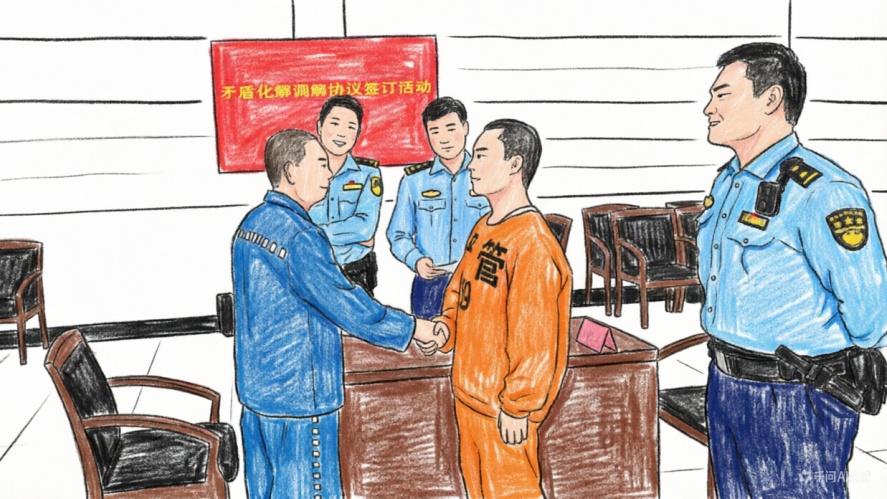 等到双方情绪逐渐稳定后,民警把双方带到一起,面对面而坐。民警严肃指出郑舟暴力行为的违法性,使他再次认清责任。在民警见证下,郑舟真诚道歉,王羽也敞开心扉,双方在《矛盾化解协议书》上郑重写下名字。此刻,理性沟通取代了对峙,误解和怨气在坦诚中消融。郑舟承诺遵守监规、杜绝暴力;王羽表示接受道歉。两只手握在一起——这不仅是一场纠纷的终结,更是两人改造路上的新起点。