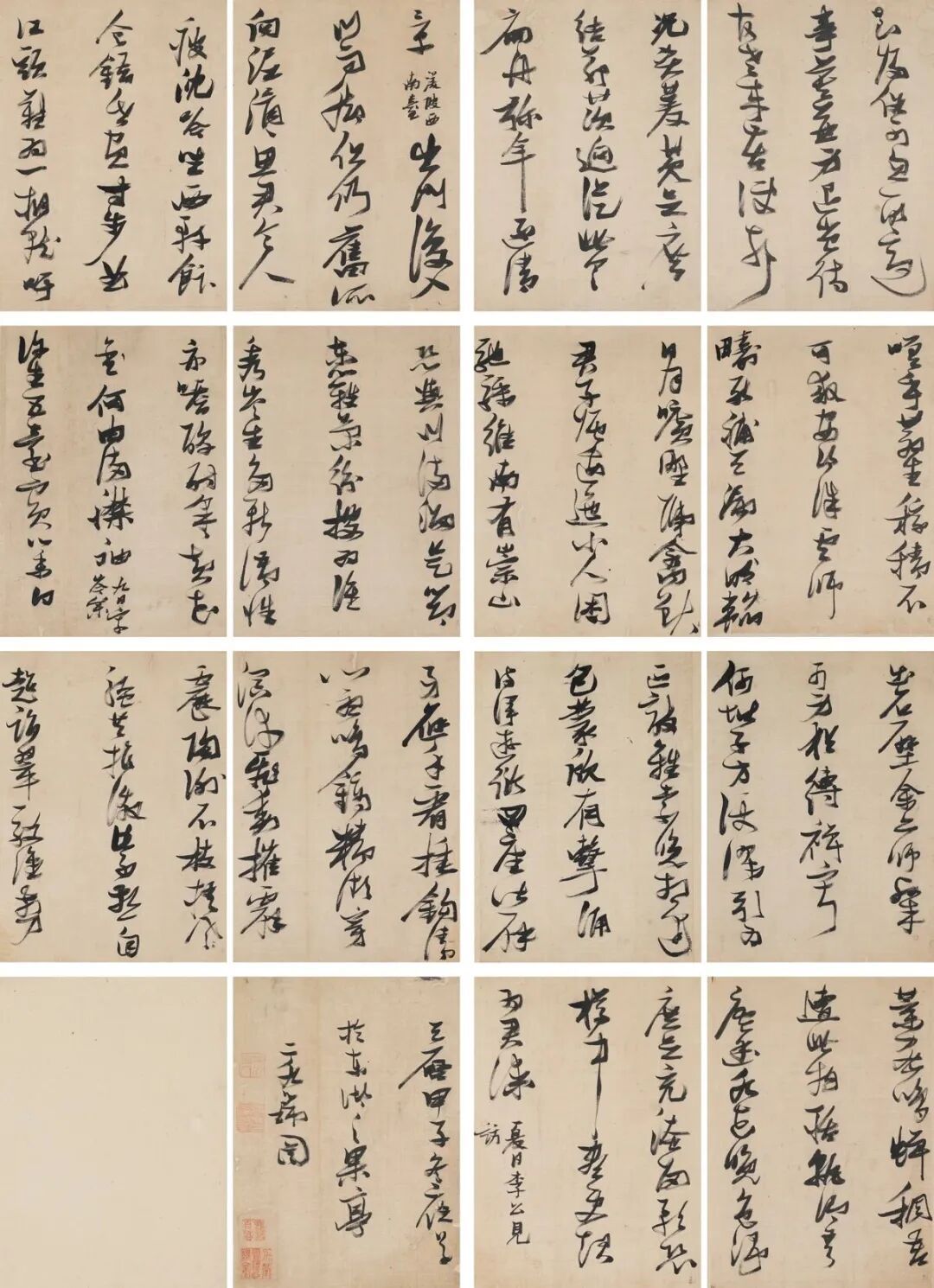 王铎擅书法,习书亦相当勤力,曾自称“余于书、于画、于文、于字,沉心驱智,割情断欲,直思臻彼堂奥,恨古人不见,故饮食梦寐以求之。”他的草书,自有一派“精骛八极,心游万仞”的气象,姜绍书《无声诗史》曾称其“行草书宗山阴父子,正书出钟元常,虽模范钟王,亦能自出胸臆”。草书创作与楷、隶、篆书有所区别,更趋情绪与灵感。这位一失足成千古恨的复杂人物,如果单纯以人论书,未免略显狭隘。假使张旭与怀素是“醉来把笔”,那么王铎则称得上是“嵩山绝顶”。