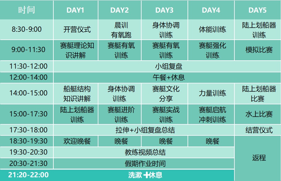 0 基础班专为无赛艇经验的青少年开设。无论年龄大小,通过一个营期的陆上与水上系统训练,均可从零基础稳步进阶,掌握赛艇基础技能,完成从入门到独立划行的提升。