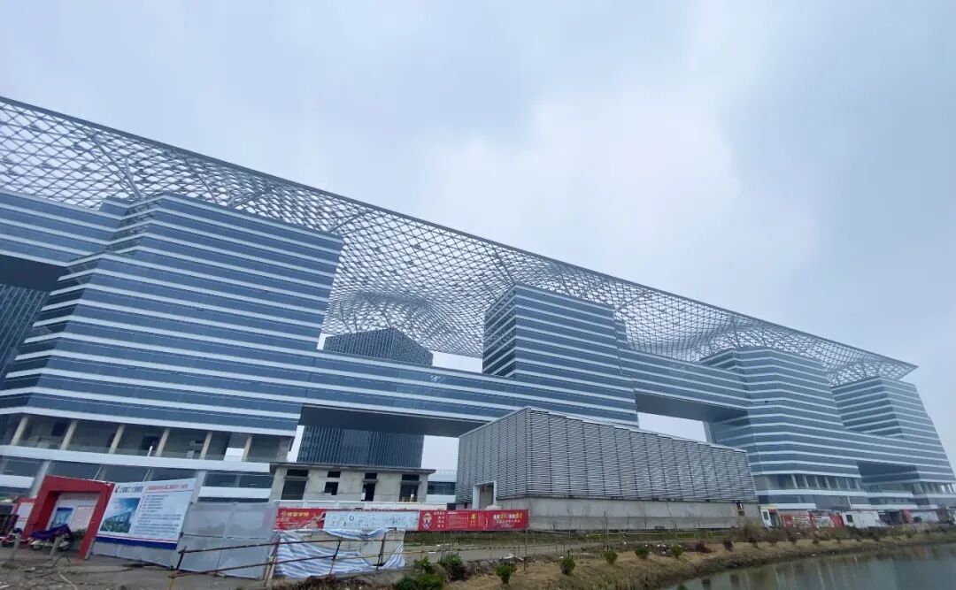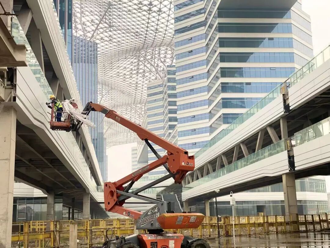 记者在建设现场看到,如波浪般起伏的银色网状屋盖横跨于22栋高楼之巅,其下,二期项目总面积达25万平方米的玻璃幕墙已安装完毕,超过11万盏泛光灯具如星辰般密布于建筑立面。