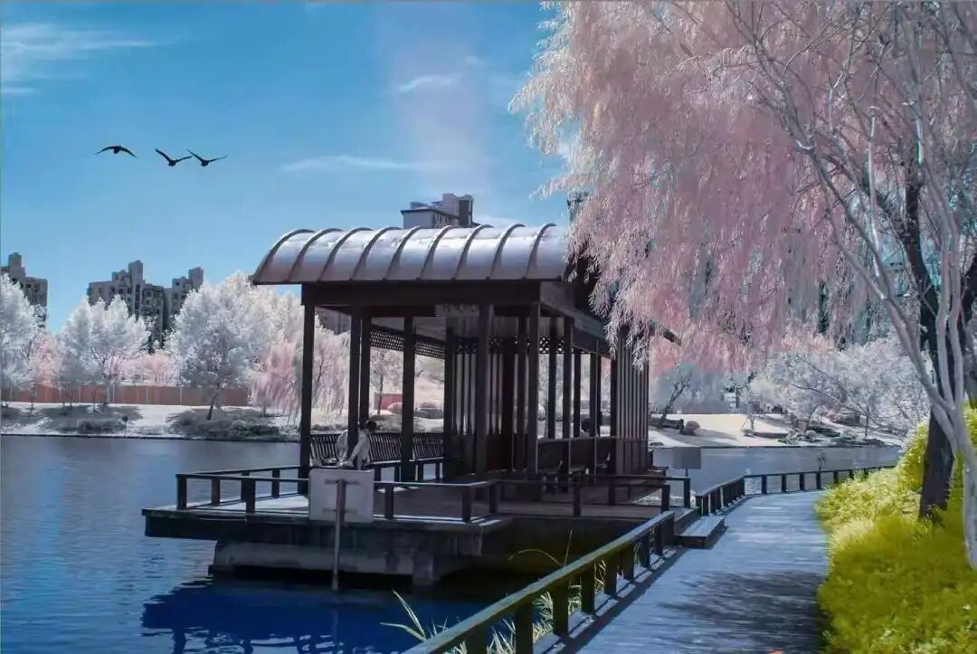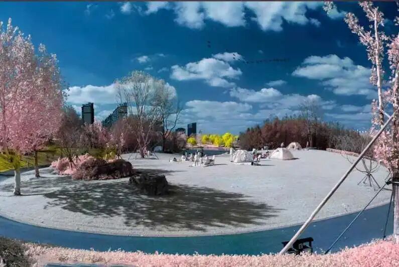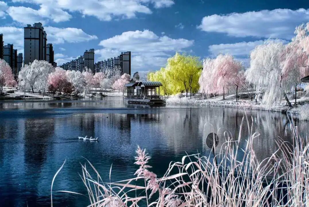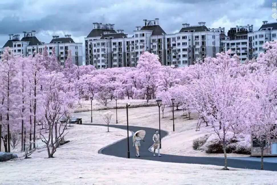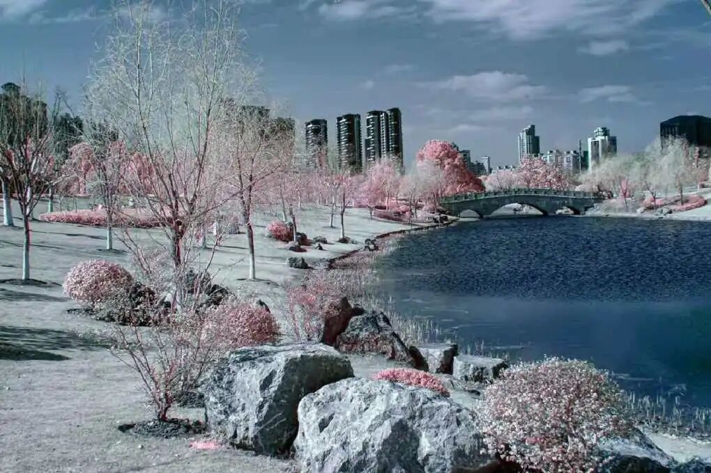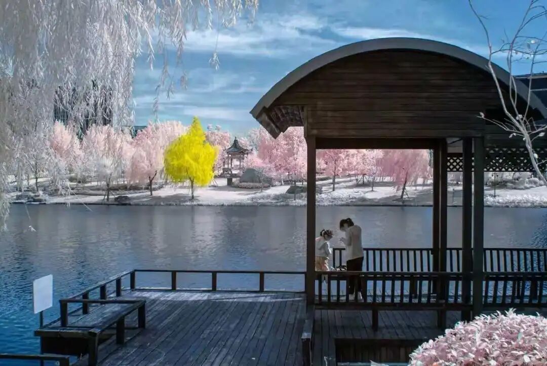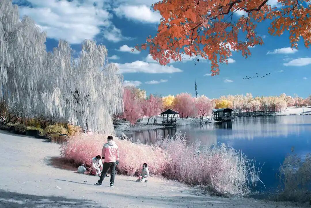 2019年,李卫接触到了红外摄影。早期滤镜方案是“盲盒”——先对焦、再装滤镜,对曝光度心里完全没数,拍出来的也全是黑白片,“白树、黑房子”。近几年红外相机成熟了,他选择了680波段的半彩红外。这种技术能捕捉肉眼不可见的光线:有生命的植被呈现白色,无生命的物体保持原色。后期通过通道互换,白色可转为各种色彩。“红外线必须要有植被,房子颜色基本不变,植被变了,最有意思的是通过通道互换,蓝天和湖水的色彩不变,色彩随你心情愉悦来决定。”为了试验,他跑遍了上海周边的古镇:练塘、朱家角……梅陇大大小小的公园也留下了他的足迹。