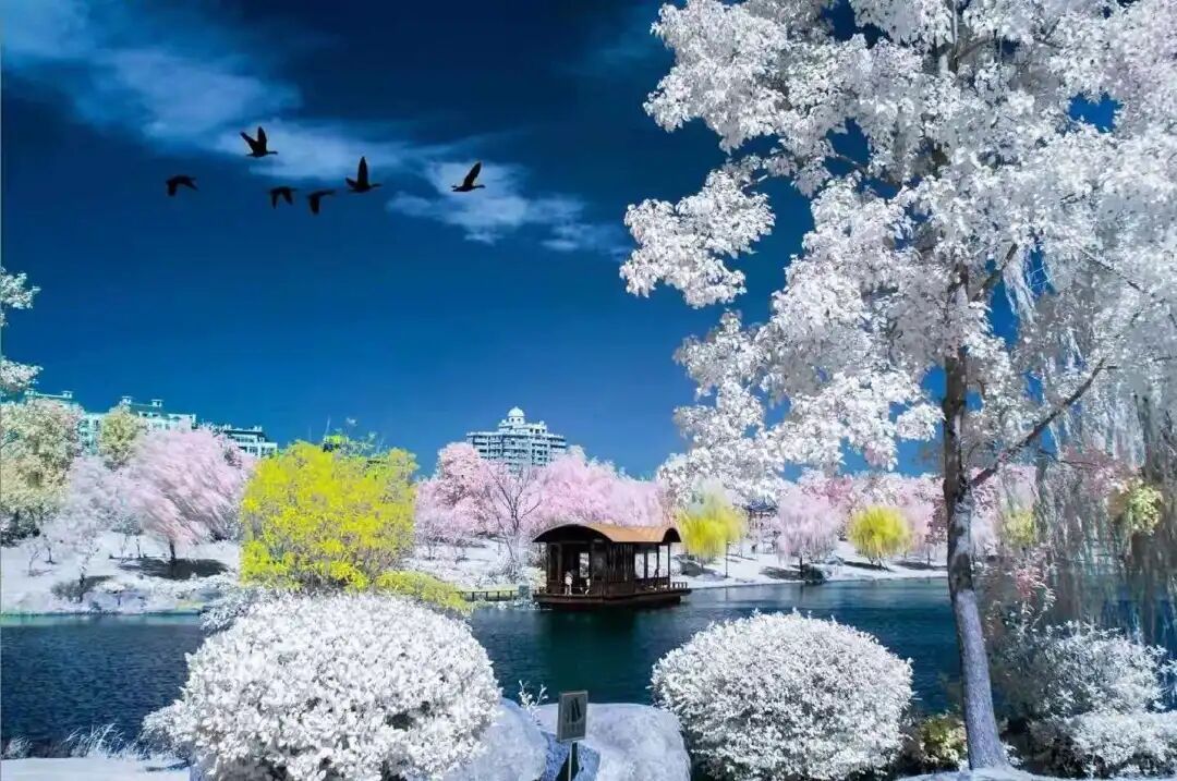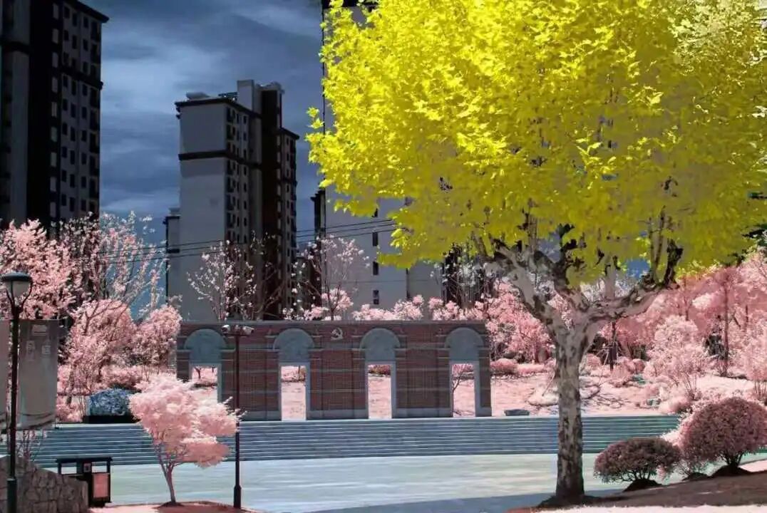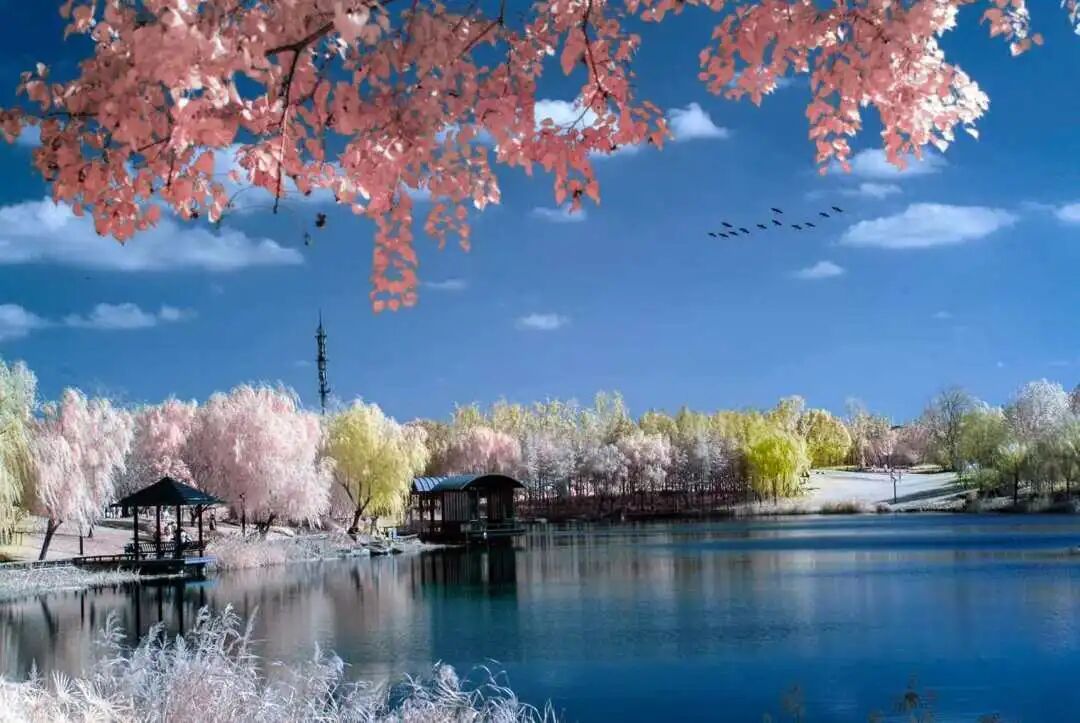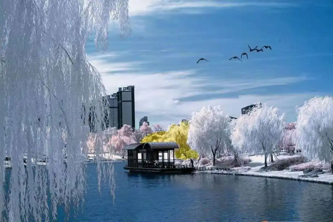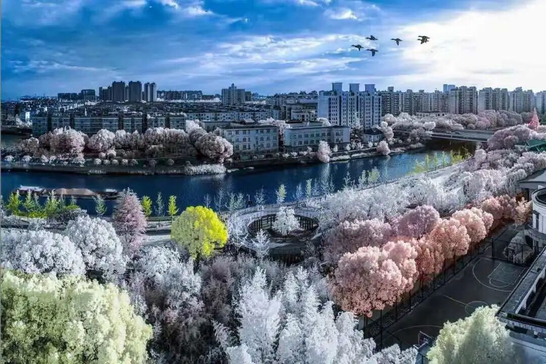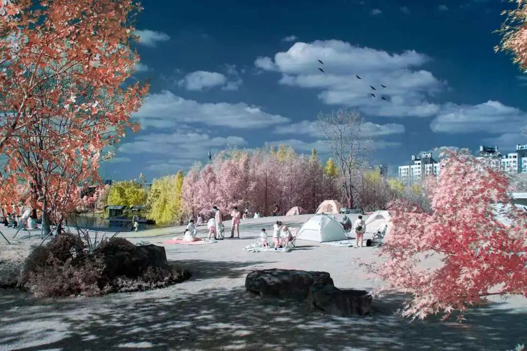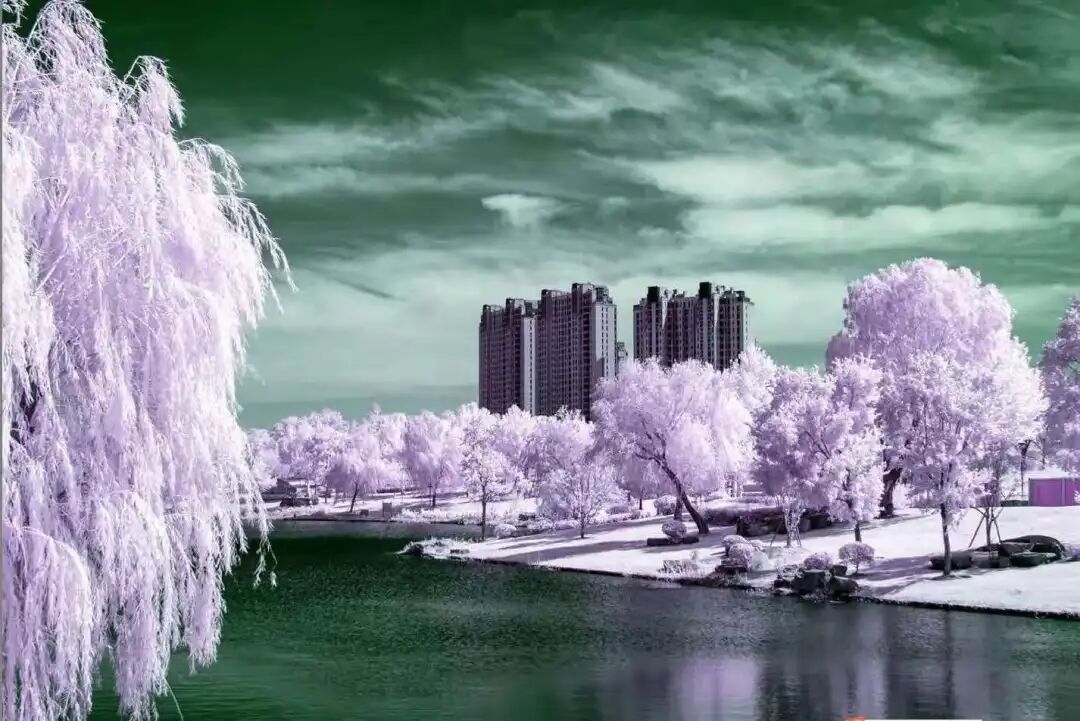 2019年,李卫接触到了红外摄影。早期滤镜方案是“盲盒”——先对焦、再装滤镜,对曝光度心里完全没数,拍出来的也全是黑白片,“白树、黑房子”。近几年红外相机成熟了,他选择了680波段的半彩红外。这种技术能捕捉肉眼不可见的光线:有生命的植被呈现白色,无生命的物体保持原色。后期通过通道互换,白色可转为各种色彩。“红外线必须要有植被,房子颜色基本不变,植被变了,最有意思的是通过通道互换,蓝天和湖水的色彩不变,色彩随你心情愉悦来决定。”为了试验,他跑遍了上海周边的古镇:练塘、朱家角……梅陇大大小小的公园也留下了他的足迹。
