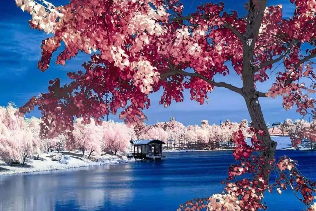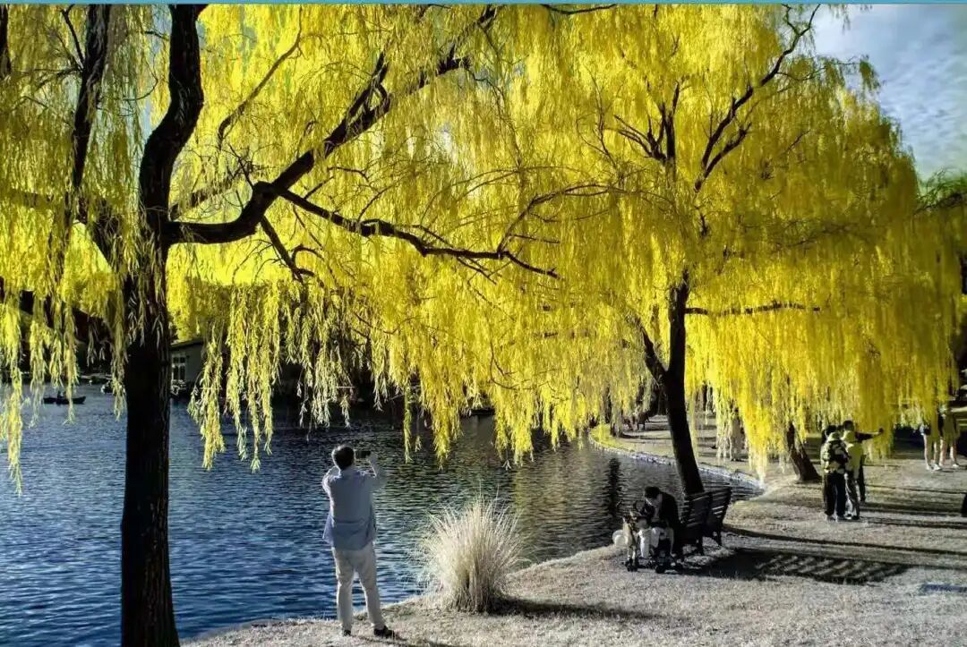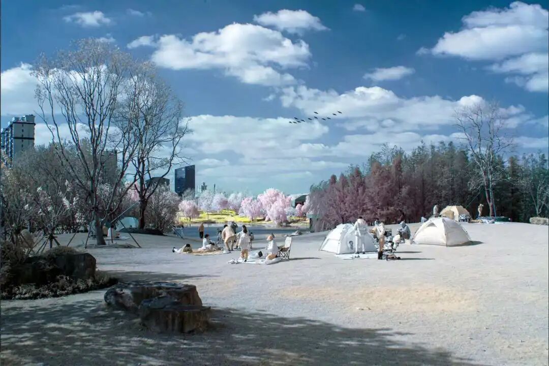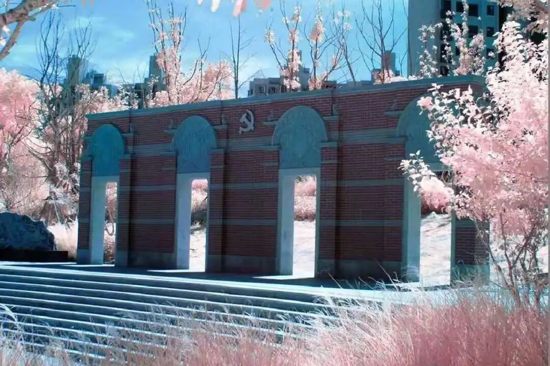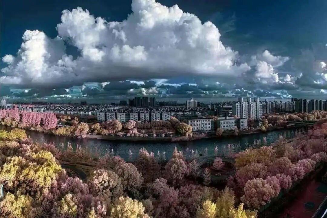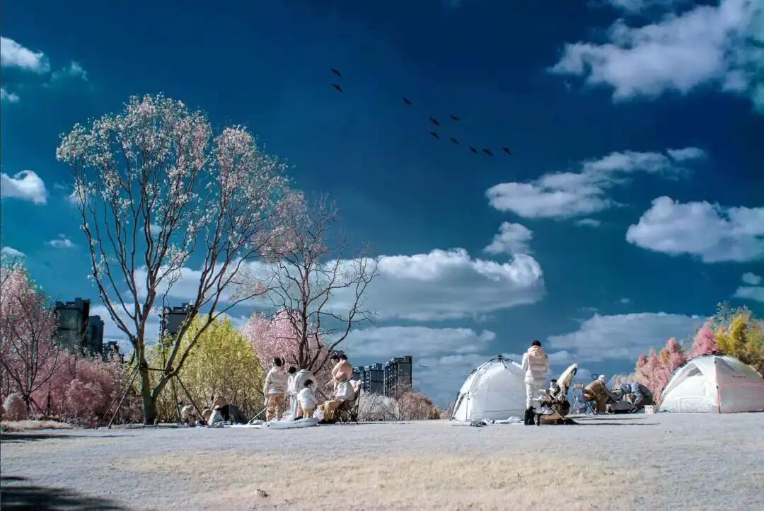 2019年,李卫接触到了红外摄影。早期滤镜方案是“盲盒”——先对焦、再装滤镜,对曝光度心里完全没数,拍出来的也全是黑白片,“白树、黑房子”。近几年红外相机成熟了,他选择了680波段的半彩红外。这种技术能捕捉肉眼不可见的光线:有生命的植被呈现白色,无生命的物体保持原色。后期通过通道互换,白色可转为各种色彩。“红外线必须要有植被,房子颜色基本不变,植被变了,最有意思的是通过通道互换,蓝天和湖水的色彩不变,色彩随你心情愉悦来决定。”为了试验,他跑遍了上海周边的古镇:练塘、朱家角……梅陇大大小小的公园也留下了他的足迹。
