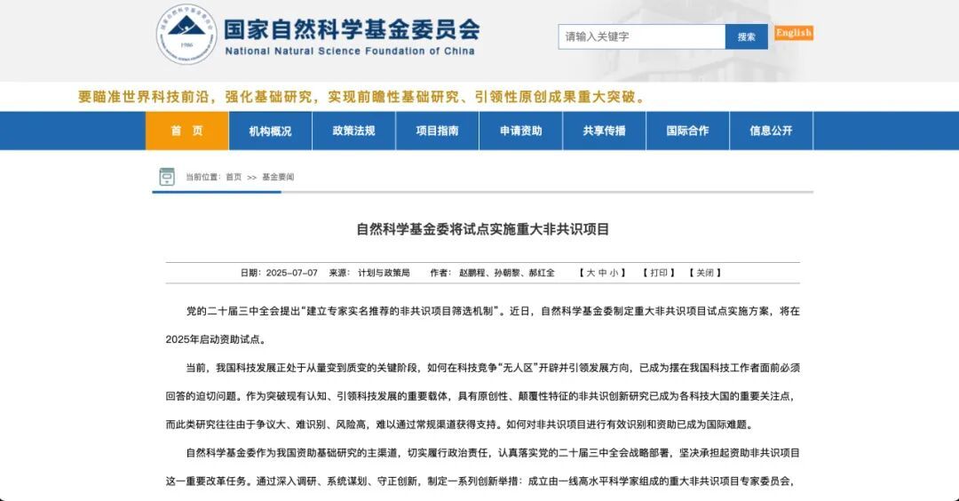 在此背景下,国家自然科学基金重大非共识项目应运而生。2025年7月,《国家自然科学基金重大非共识项目试点实施方案》审议通过,明晰了项目要具备“意义重大、争议性大、风险性高”三个核心特征。