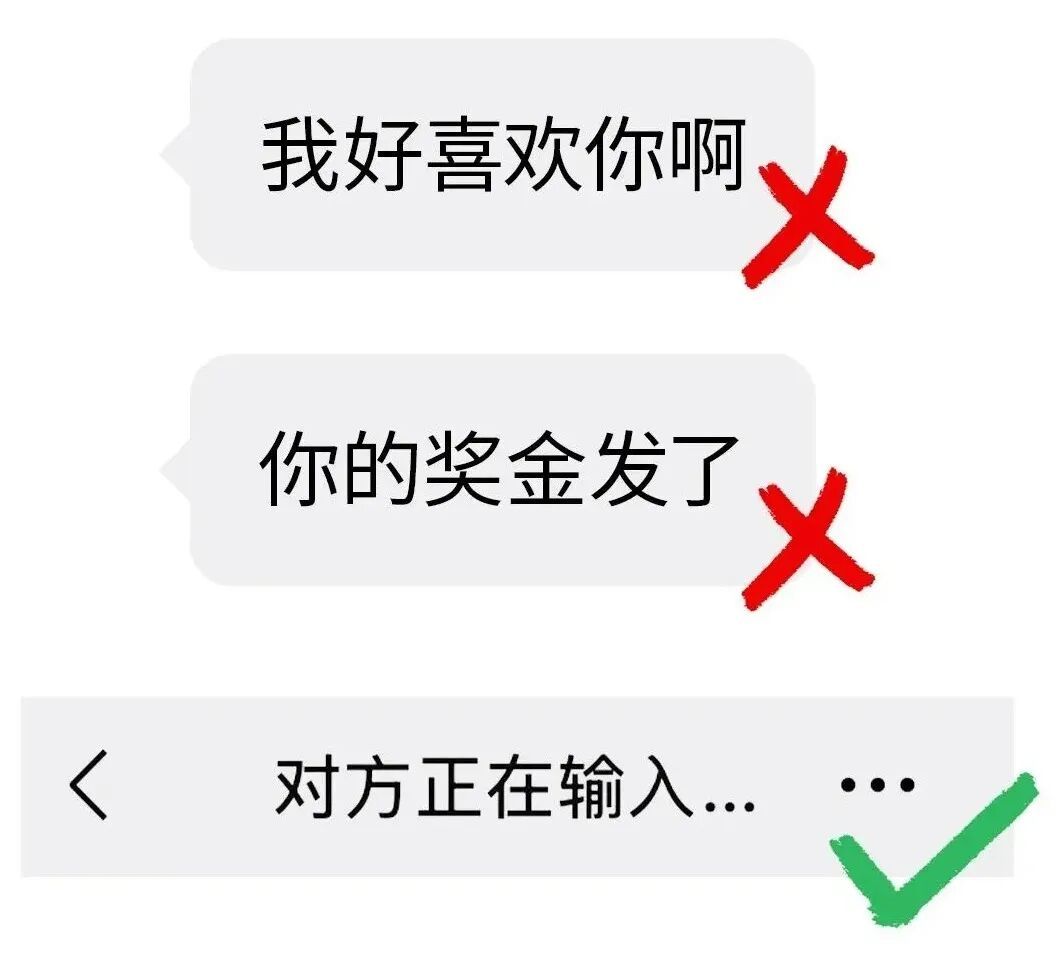 也就是说,如果你看到跟你聊天的对象出现了“对方正在输入”,那么恭喜你,至少TA还挺重视与你的聊天。由此衍伸的各种“对方正在输入”也就“破案”了: