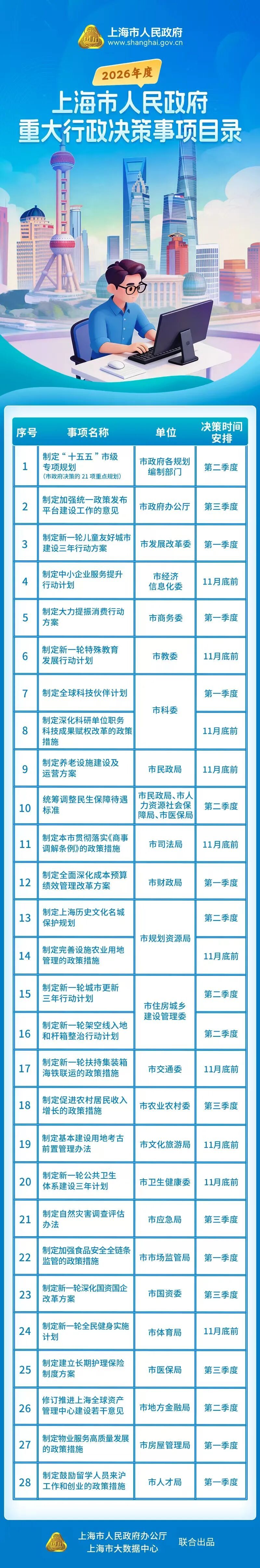 为落实重大行政决策程序制度,上海市人民政府办公厅编制了《2026年度上海市人民政府重大行政决策事项目录》,内容包括制定“十五五”市级专项规划、制定加强统一政策发布平台建设工作的意见、全球科技伙伴计划等。