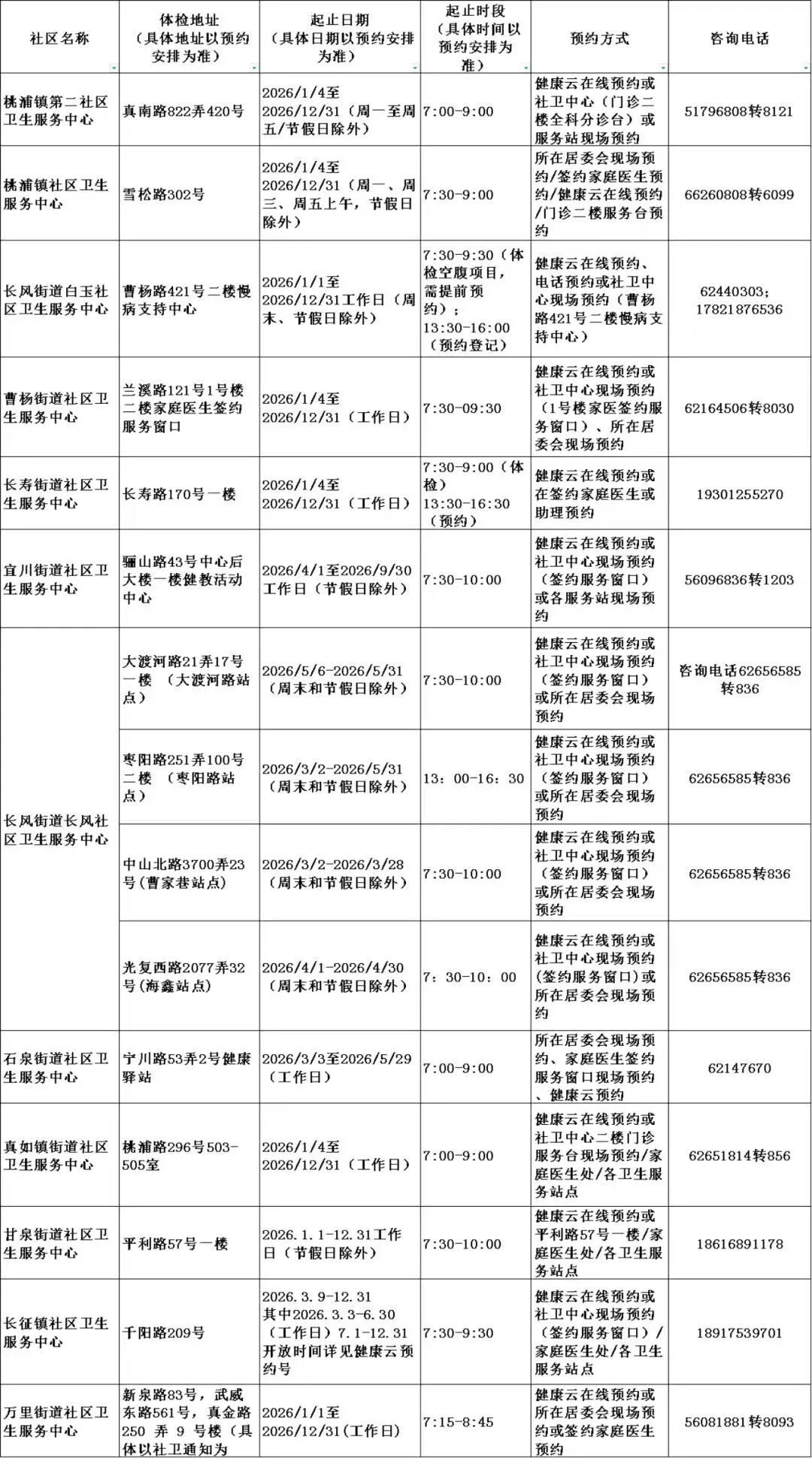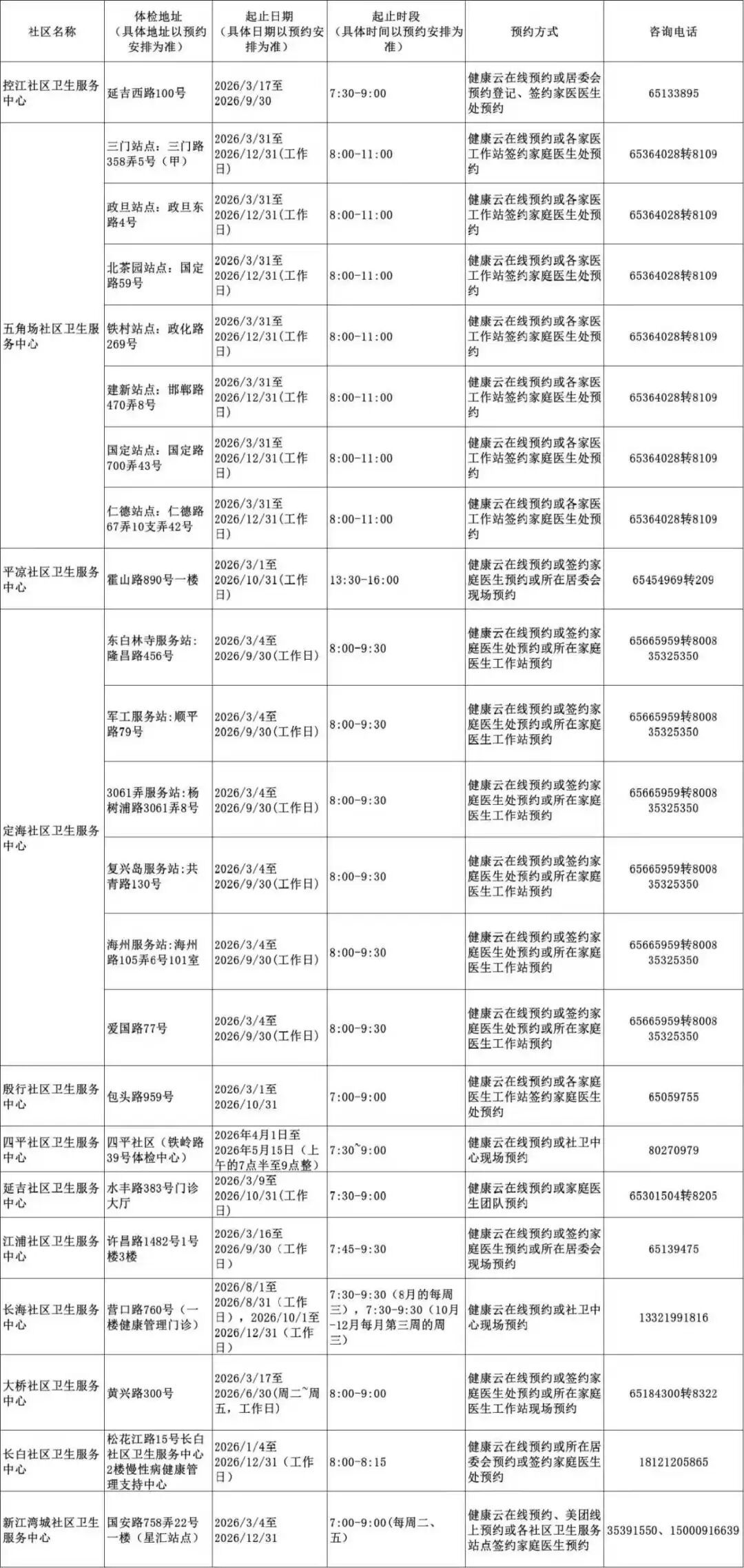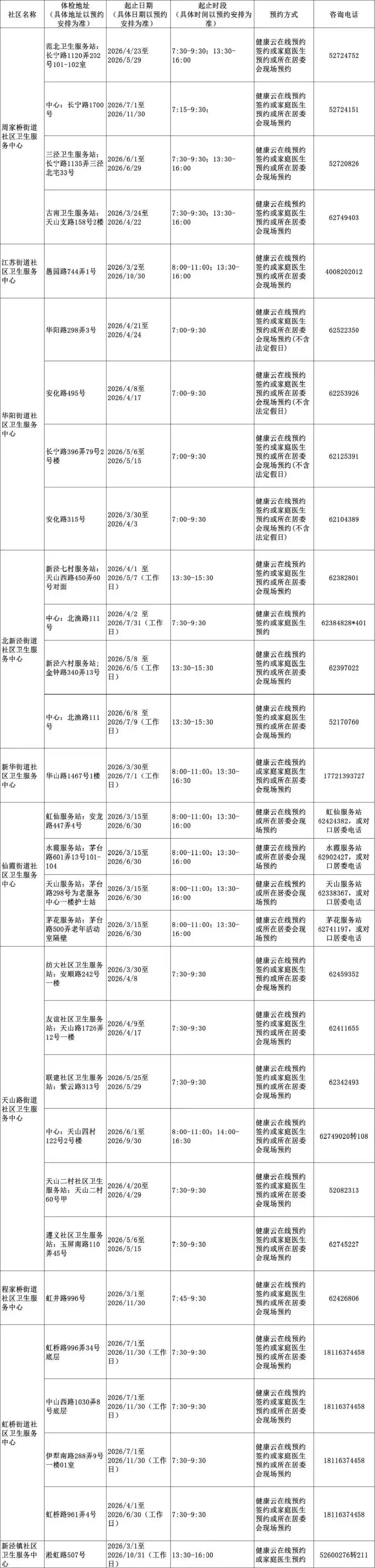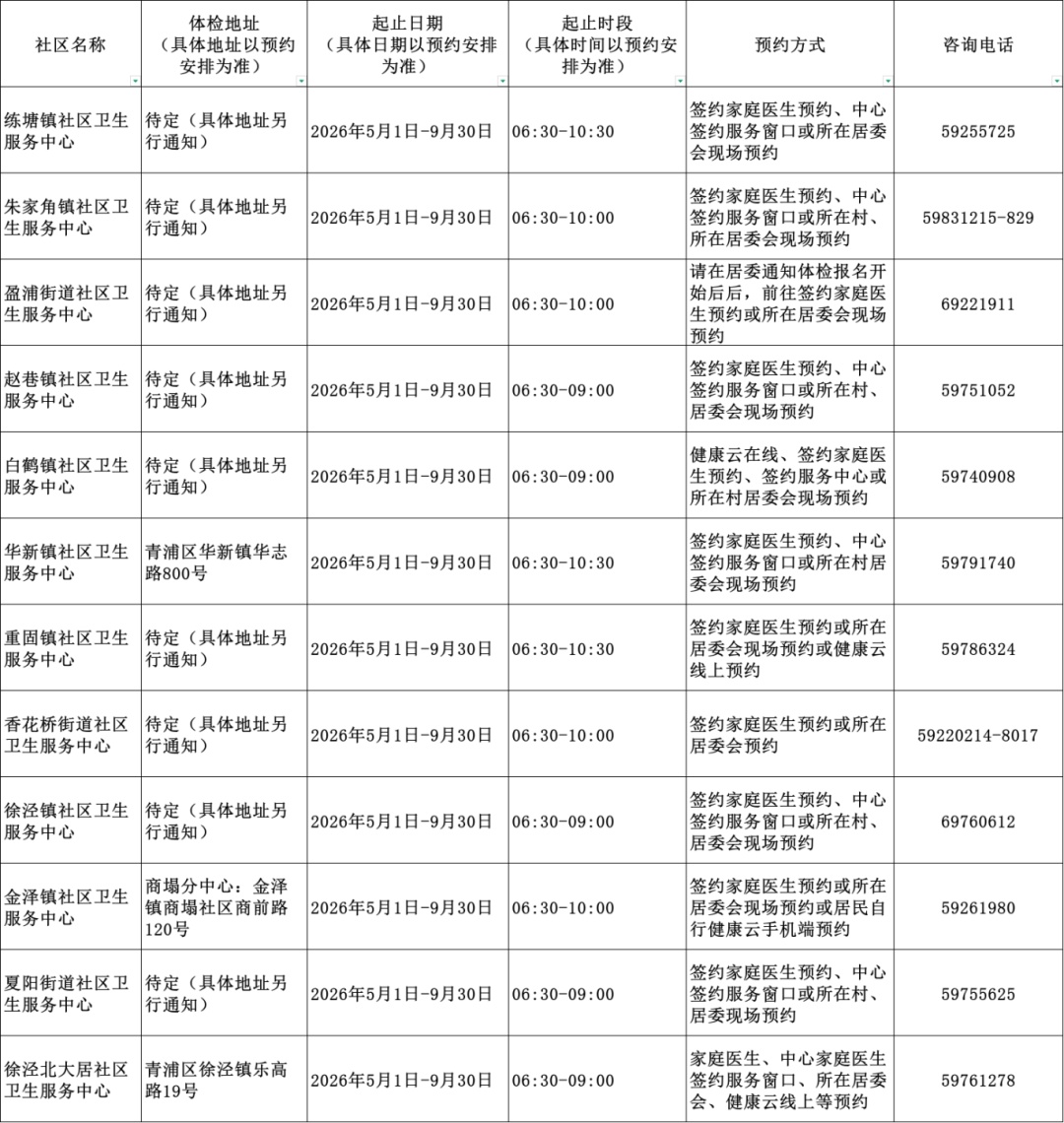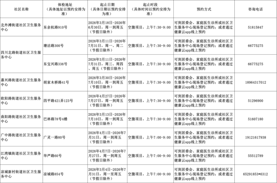 2026年上海市老年人健康体检信息一览表