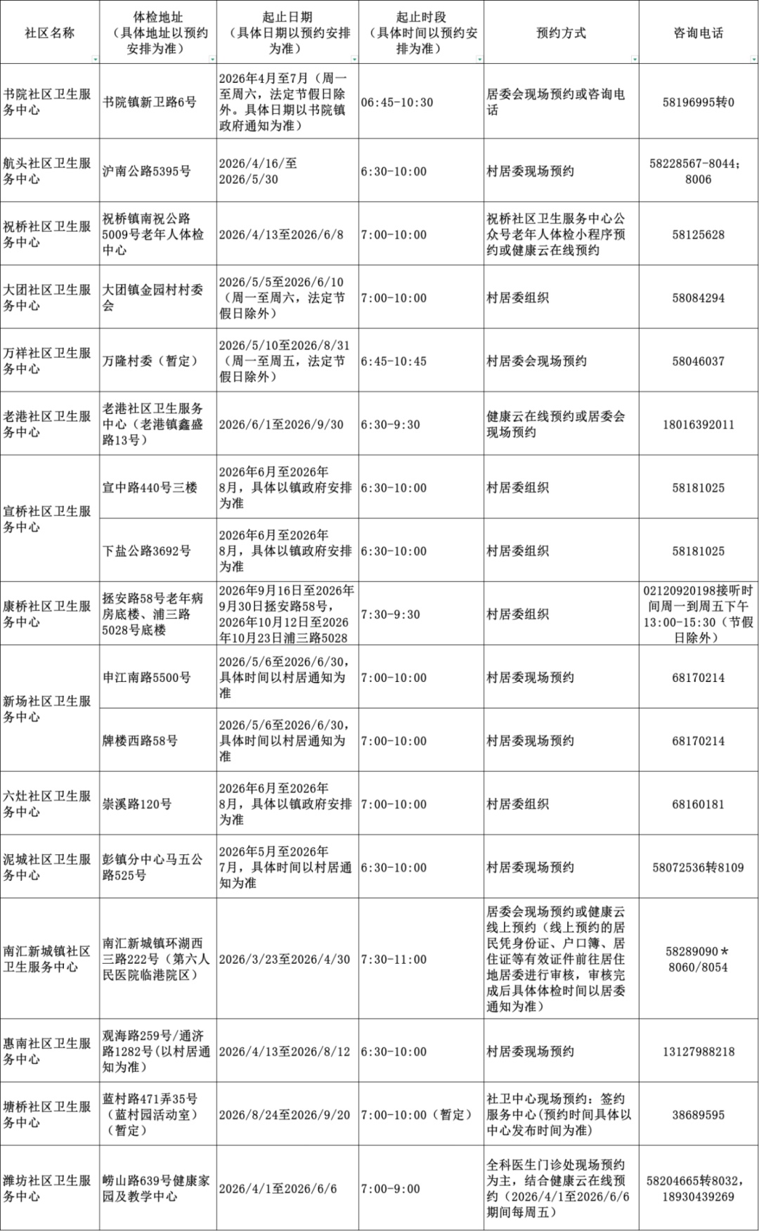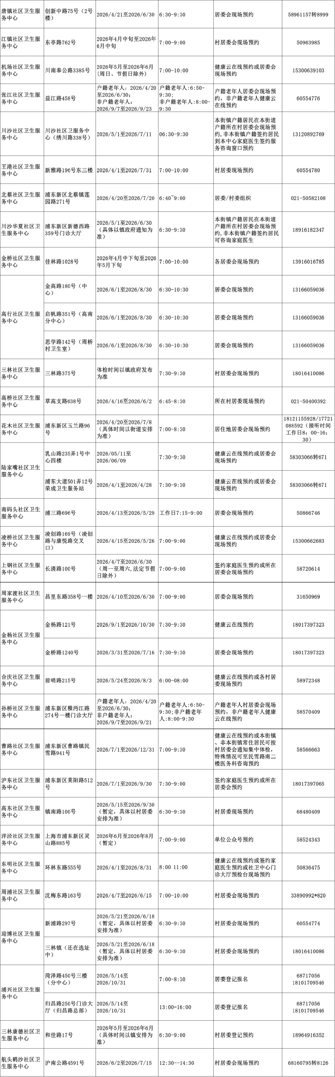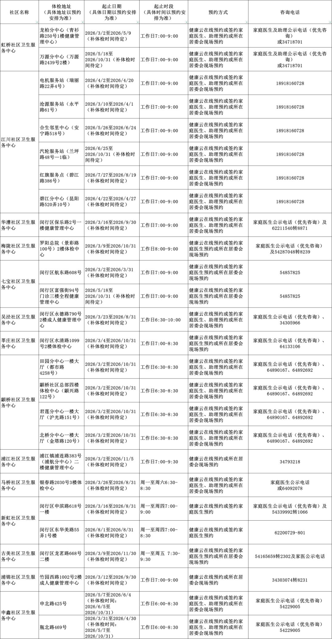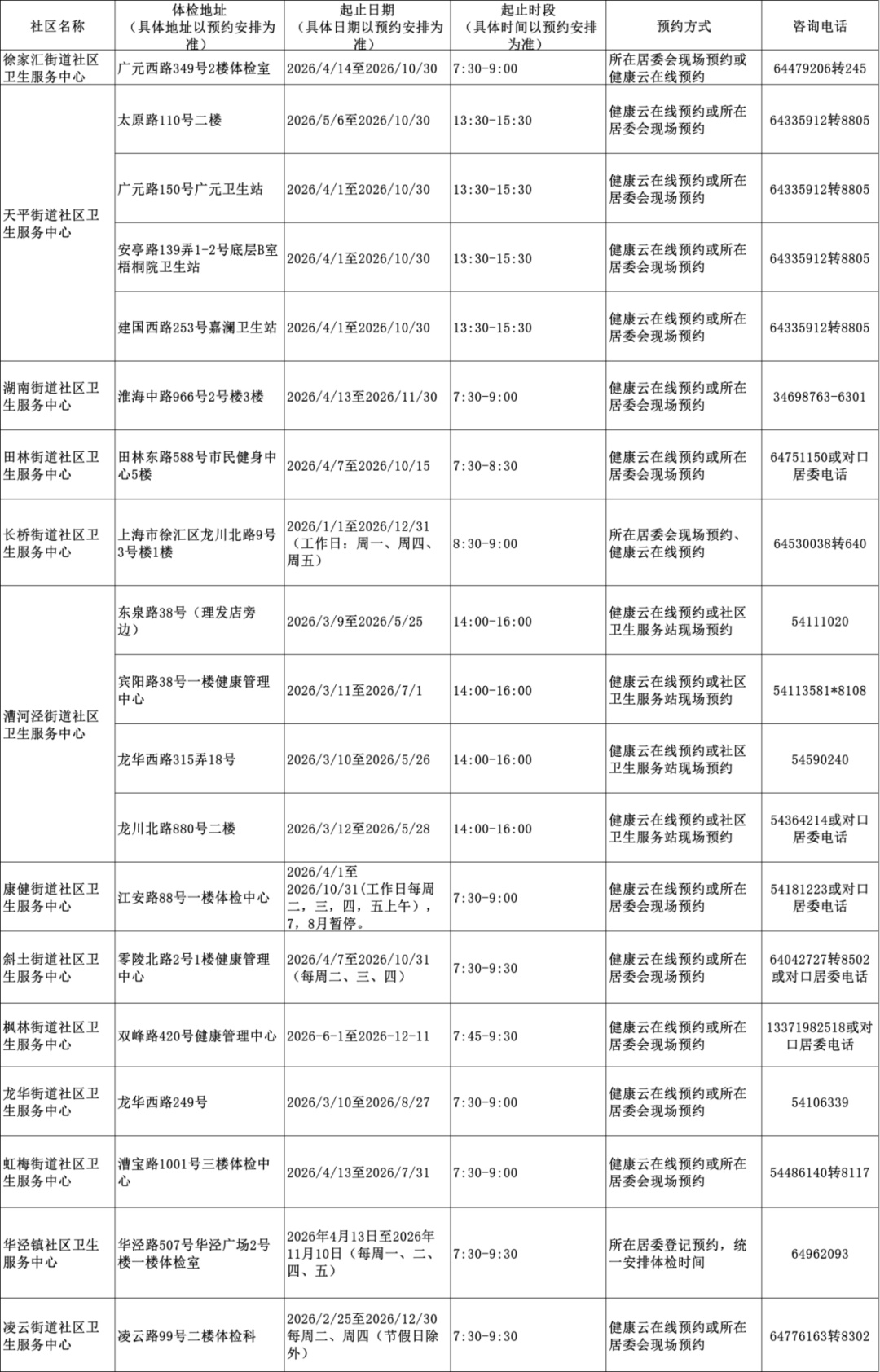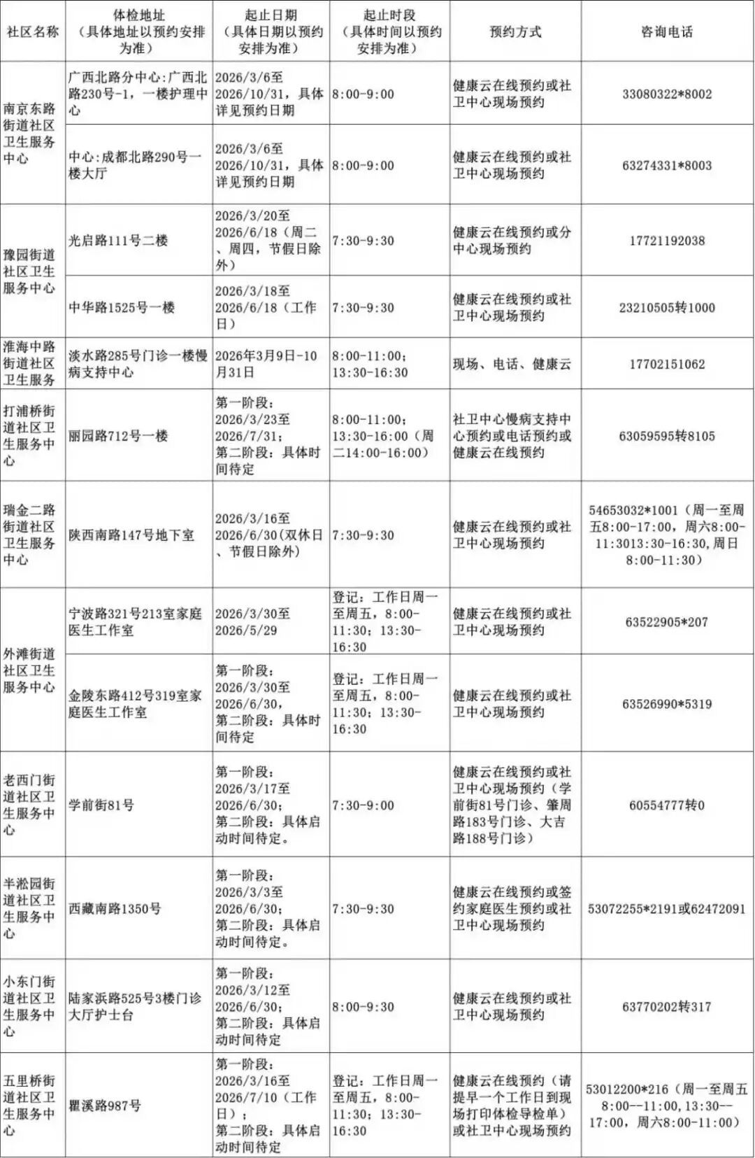 2026年上海市老年人健康体检信息一览表