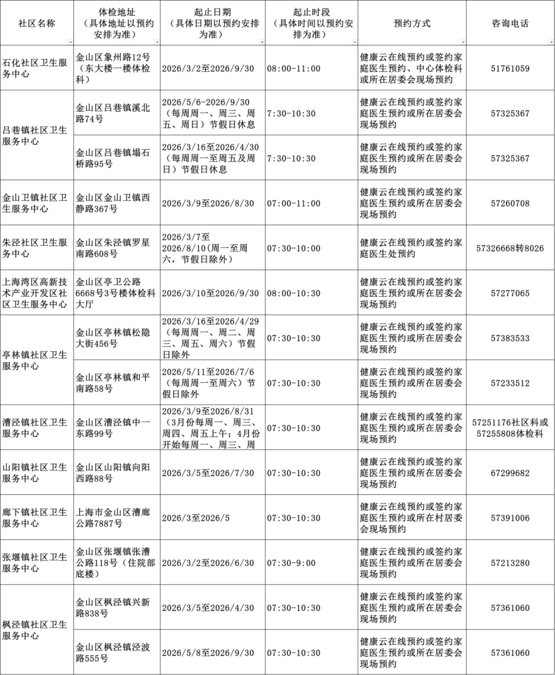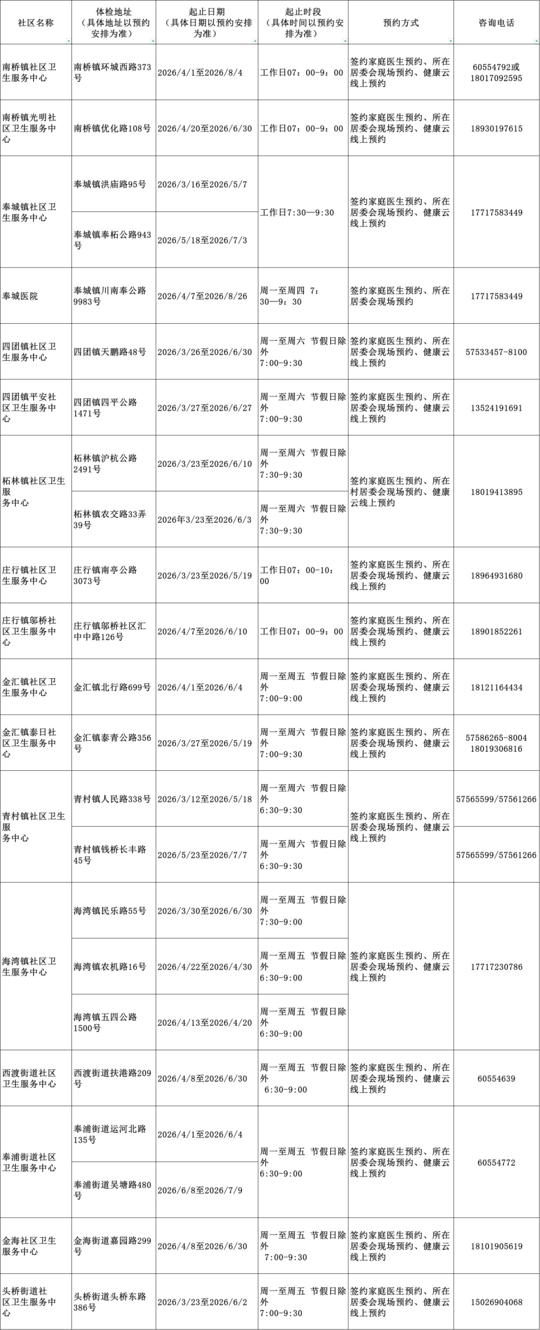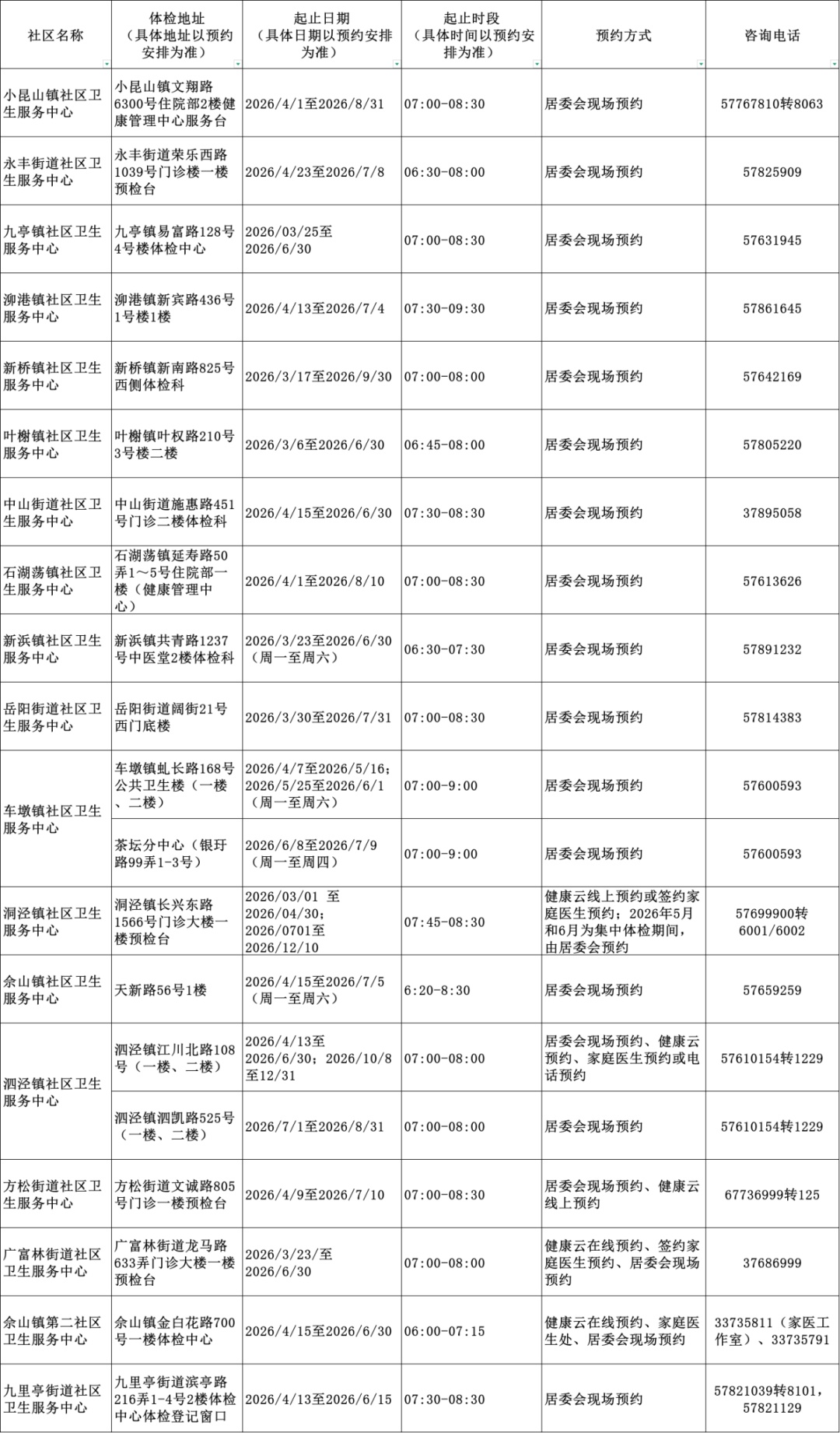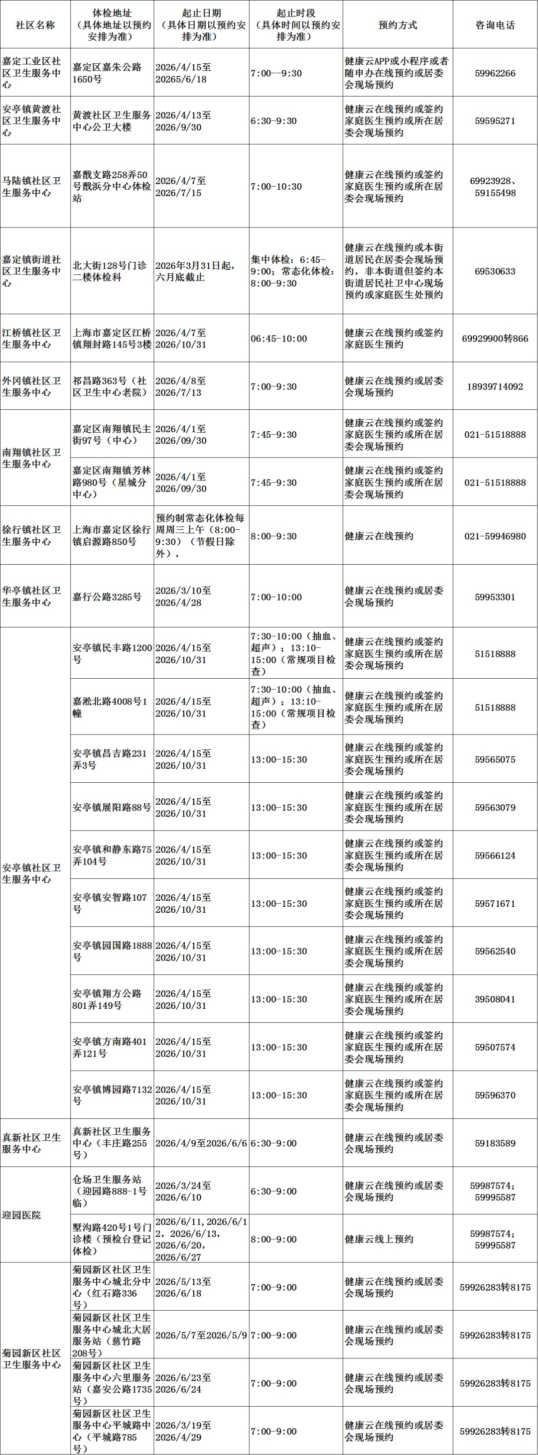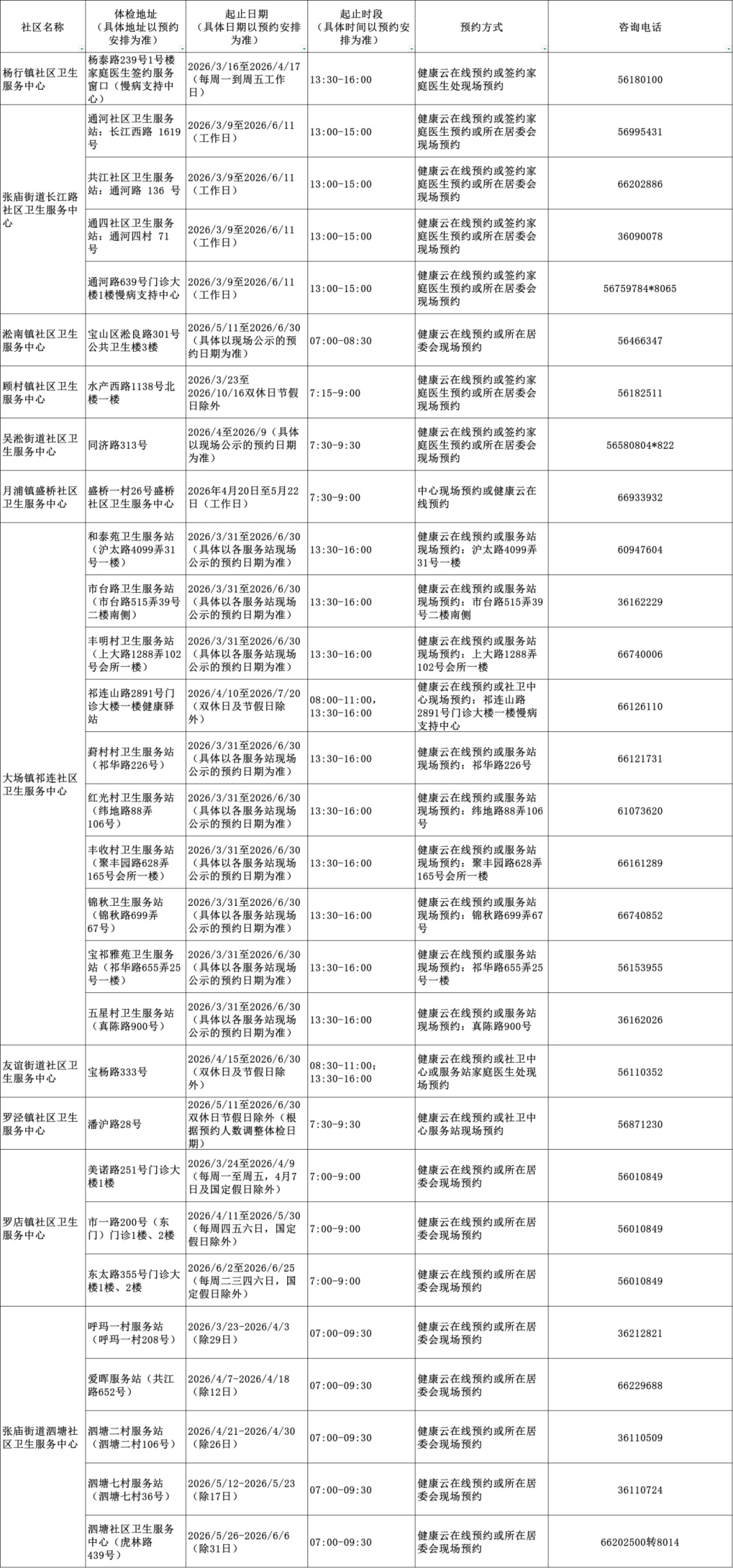 2026年上海市老年人健康体检信息一览表