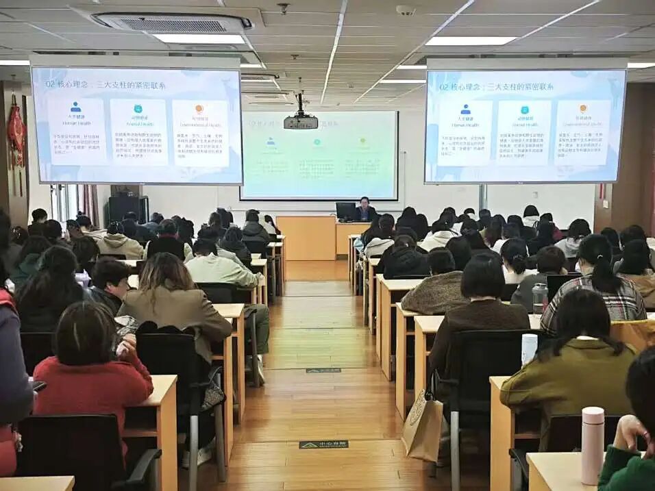 本次培训紧扣当前校园传染病防控形势,围绕2025年宝山区学校疫情概况,设置了结核病、手足口病、流感、水痘等7个常见传染病防控课程,同时也引入了“全健康理念”的新课程,为参训人员拓宽防控视野。 作为本次培训的亮点,区疾控中心(区卫监所)特别设置的《全健康(One Health)理念:校园与社区的协同实践》专题课程,系统介绍了“全健康”这一国际前沿理念。课程指出,约70%的新发传染病源自动物,人类健康、动物健康、环境健康三者密不可分,传统的条块分割管理模式已难以应对复杂的健康挑战,必须转向“以系统为中心”的全健康模式,从源头预防、跨学科协同的角度守护健康。 培训重点探讨了“全健康”理念在校园与社区场景下的落地路径。校园是核心易感人群的聚集地,社区是健康风险的传导带,两者相互影响。为此,培训提出建立常态化沟通、联合排查、联合宣教、应急联动四大机制,打破壁垒,形成合力。同时提出依托“医教结合”平台,探索建立宝山区全健康校园—社区联动工作机制,推动全健康理念在宝山落地生根。