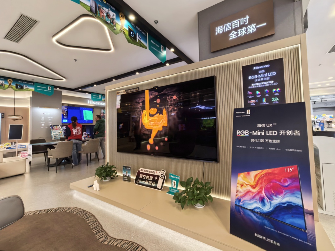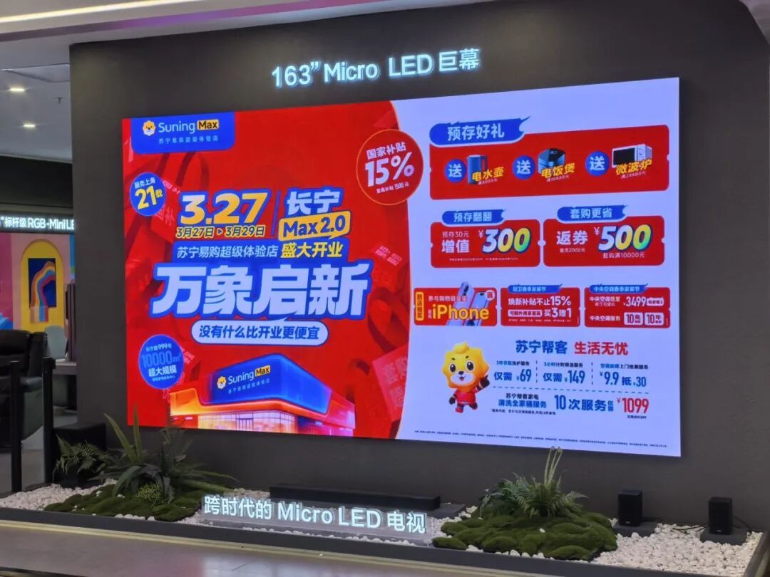 此次焕新,苏宁易购长宁路店依旧保留了特色的巨幕电视体验。163寸TCL Micro LED巨幕电视带来的影院级影音体验颇为震撼,画面细腻度与色彩还原度达专业影院标准。一旁的电视品牌体验区,也相继推出了巨幕电视新品。例如海信UX 116英寸,作为全球首款RGB Mini-LED巨幕电视,搭载了行业领先的玲珑4芯真彩背光技术,被业界视为“画质天花板”。“Mini LED、AI画质芯片等技术普及,让高画质大屏成本大幅下降。同时,电视承载了观影、游戏、健身、K歌、投屏办公等多场景功能需求,已成为了不少现代家庭的‘刚需产品’。”工作人员介绍。