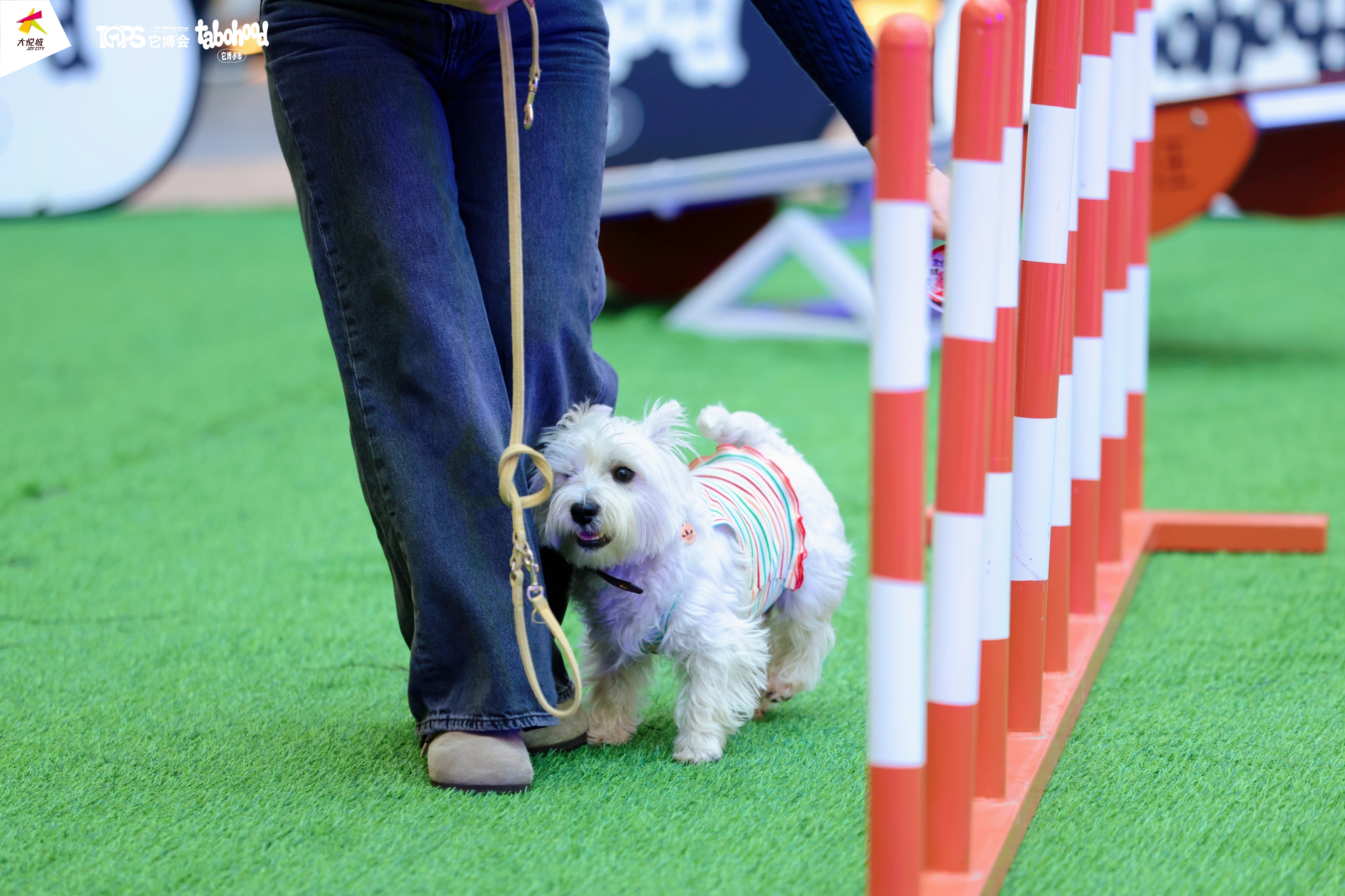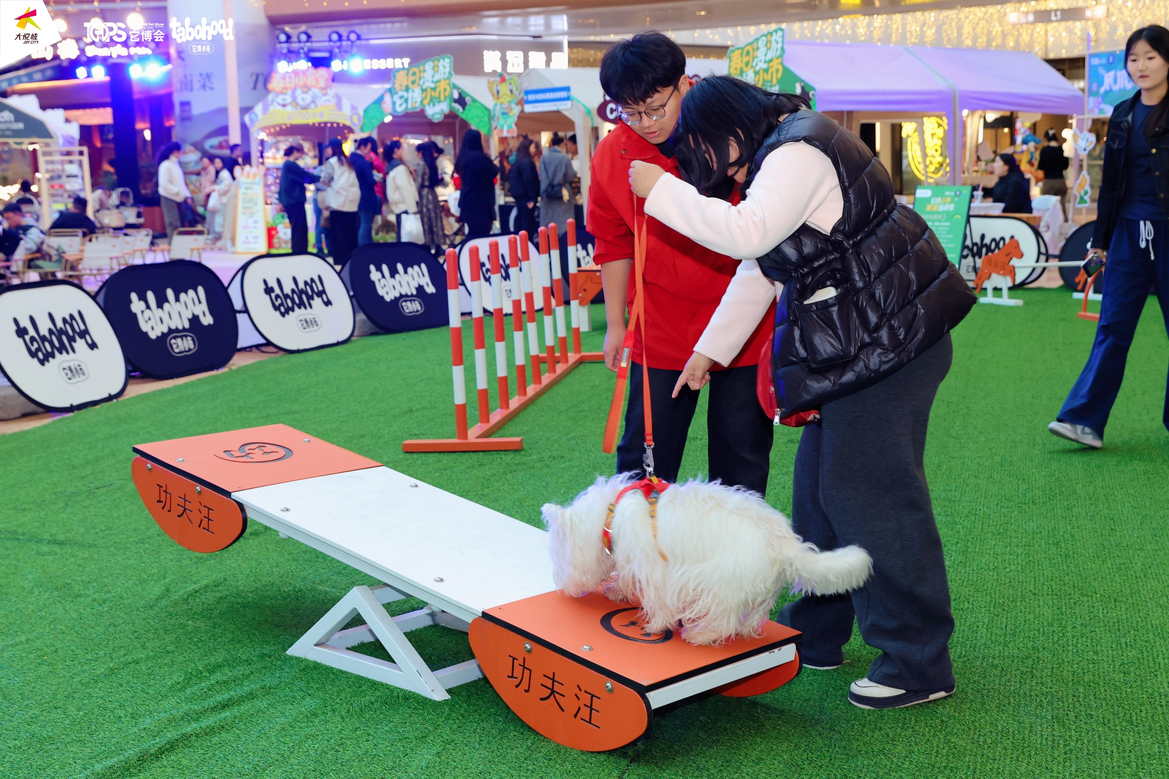 在市集的互动体验区,拔河、绕桩、平衡球挑战,正吸引着众多“汪星人”一展身手。狗狗们在主人的引导下活力四射,引得围观市民笑声不断。