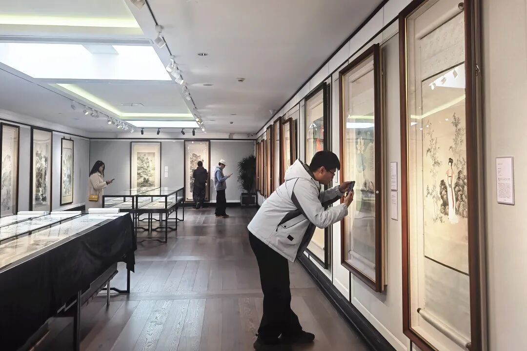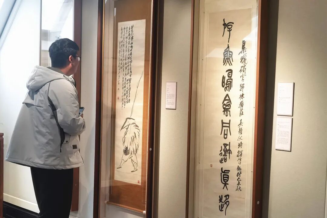 谢稚柳先生多件盛年工笔重彩精品、任伯年《隔帘仕女》、虚谷《一路荷花香到门》、赵之谦《楷书五言联》、张大千为无锡荣氏作《烟江叠嶂》、吴湖帆为叶恭绰作《天香》、吴昌硕为曹汝霖作《宝盘红玉》、陈佩秋为徐平羽作《荷花鸳鸯》、傅抱石《全家院子》、张善孖《伏虎自画像》、陆小曼《小梅学字》、张大千《行书五言巨联》等一众书画精品佳作让参观者得以深度感受海派书画在承续传统、开创新风中形成的海纳百川气度、多元丰富笔墨和与时俱进的精神。