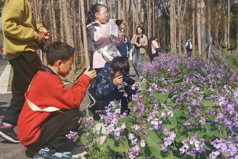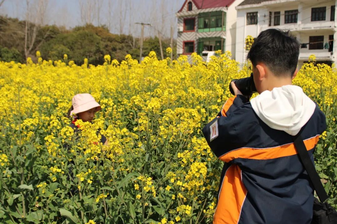 油菜花田里、古桥边、乡间小路上,随处可见三五成群的孩子。他们或蹲或站、或仰或俯,举着相机、手机,认真捕捉着春日乡村的每一个瞬间。